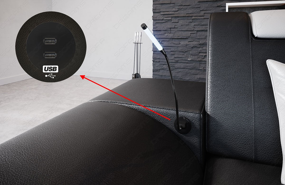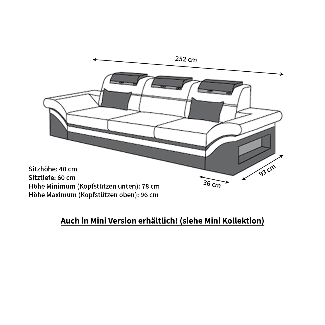The Megano sofa impresses not only with its appearance, but also with its comfort. The multi-adjustable headrests and high-quality spring core upholstery guarantee that you and your guests will feel completely comfortable. Practical storage compartments are located in the sofa's sides. The sofa is also optionally equipped with battery-operated LED lighting, which adjusts the color temperature as desired. This lighting, the relaxation function, and the USB port are also available as options. If you have any further questions, please do not hesitate to contact us.