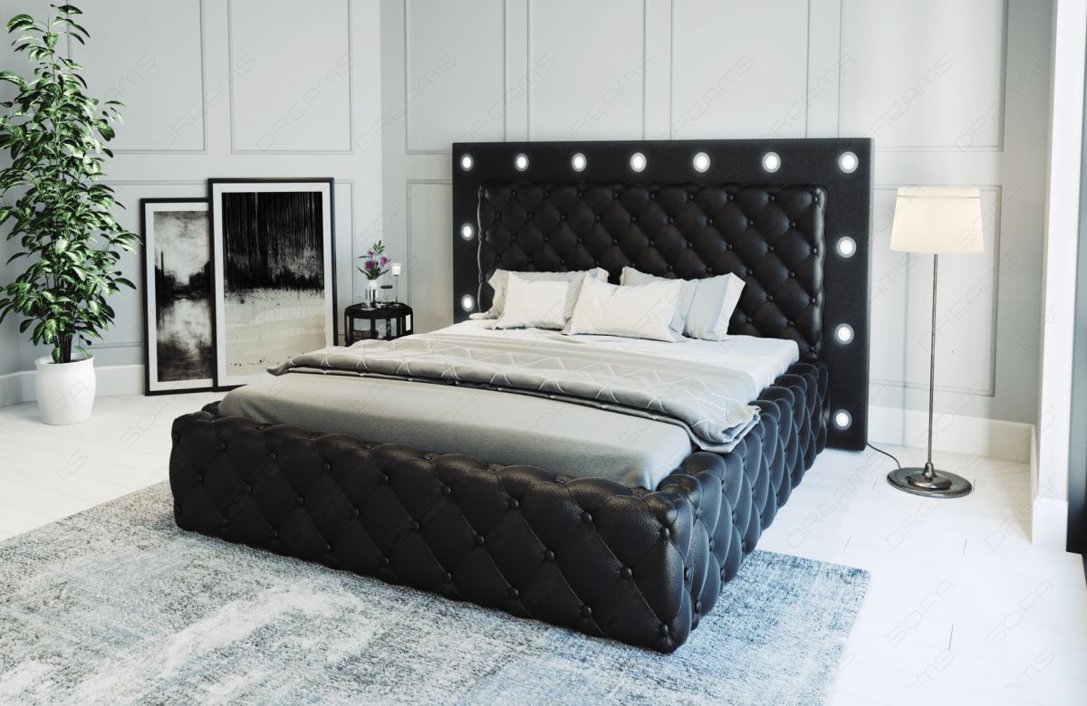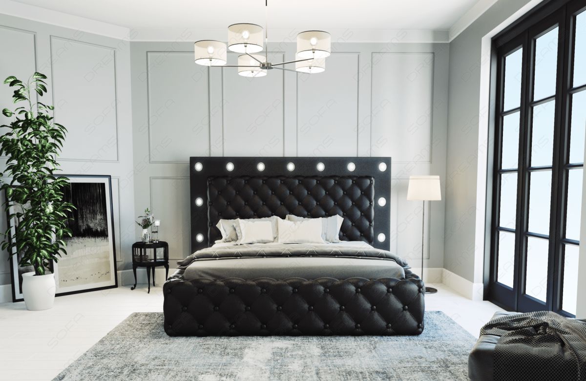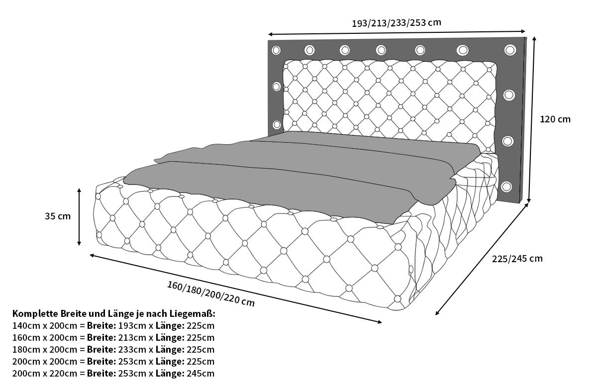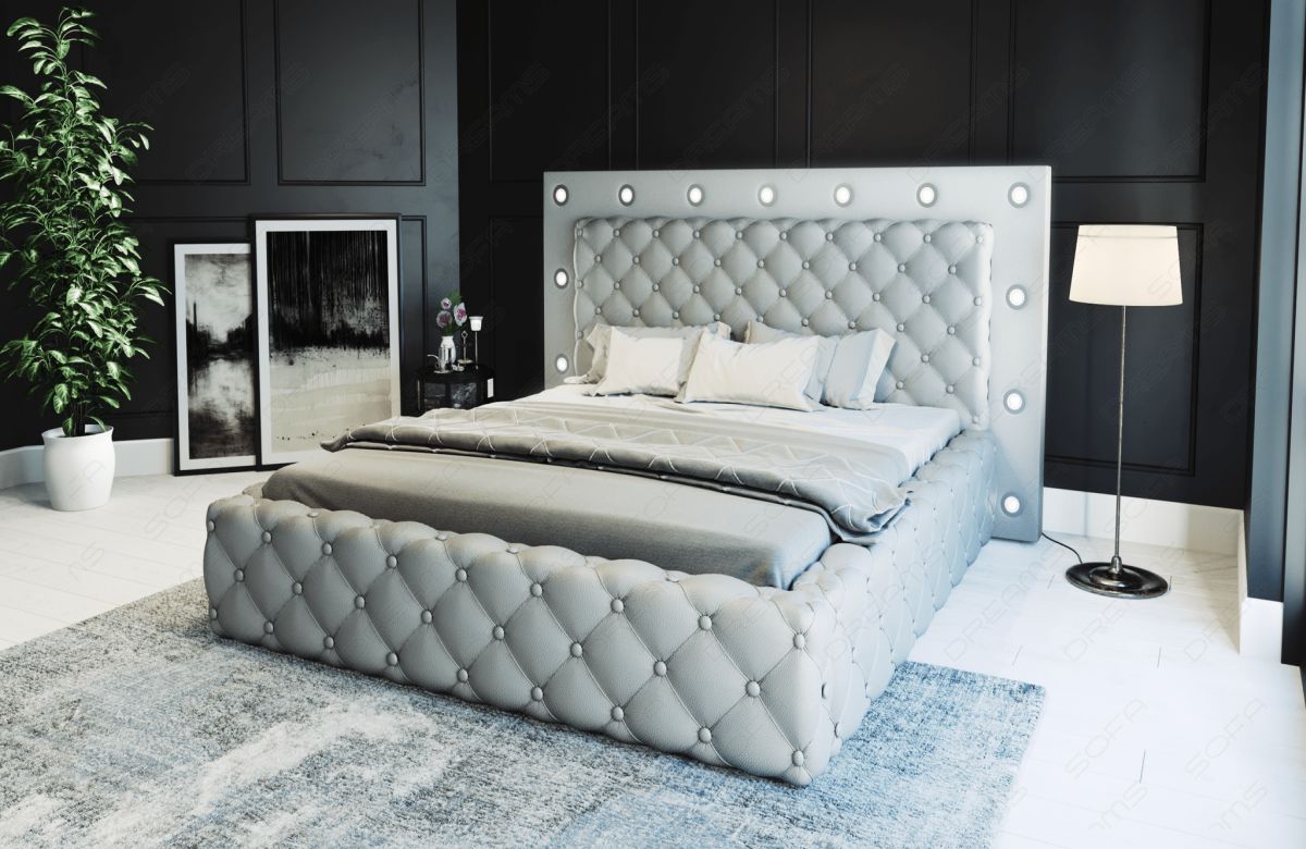 The Alessandria designer bed impresses with its complete quilting and creates a particularly luxurious effect. The striking appearance is further emphasized by LED spotlights in the headboard area. You can customize the bed by selecting the color variants. For the headboard border, you choose a secondary color, while the quilted elements are made in your desired main color. The bed is covered with high-quality artificial leather, which has a soft textile backing and a fine leather grain. It is UV-resistant, tear-resistant, and skin-friendly. The designer bed is delivered without a mattress or slatted frame. For optimal sleeping comfort, we recommend our 7-zone mattress and a sturdy slatted frame. These automatically adjust to your chosen sleeping position. The different zones of the mattress support the body by reacting to the respective weight. The mattress cover is covered with a soft, quilted fabric with breathable properties. The slatted frame is equipped with 28 slats per side, which can be adjusted using a stabilizing band in the middle.