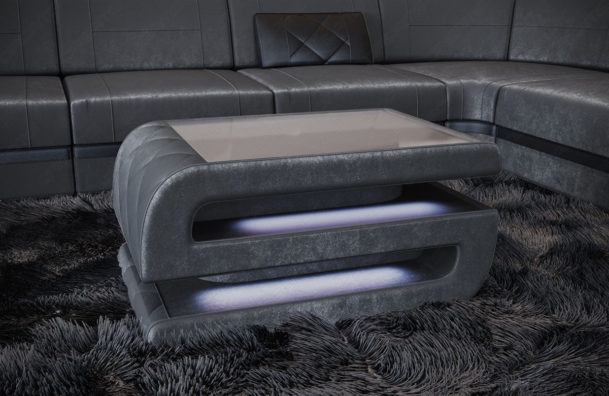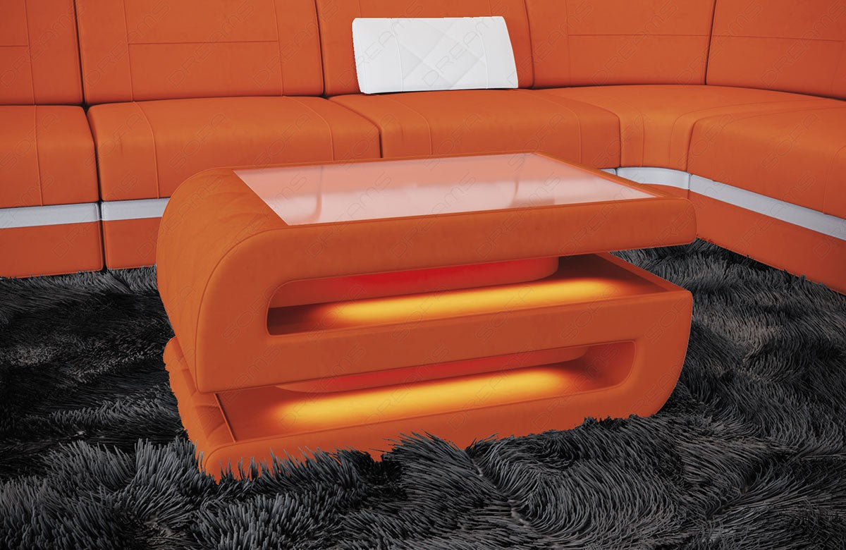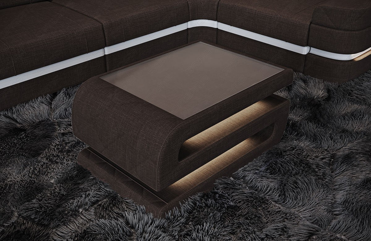 The Bologna upholstered coffee table (plain) is not only a perfect complement to the sofa of the same name, but also looks great in combination with other sofas and adds that certain something to any living room. The table's unusual design immediately draws attention. The elegance and modern shape of the coffee table make it a real eye-catcher. Upon request, the table can be equipped with LED lighting, which can be conveniently controlled with the included touch wheel remote control. With the LED lighting and the individually selected color, you can optimally showcase the table. The tabletop is made of 12 mm thick safety glass, so the table can also be used safely in households with children. The table's sturdy frame is made of robust, crack-resistant wood. The surface is particularly easy to maintain and clean. With a height of 45 cm, the Bologna coffee table offers the ideal size.