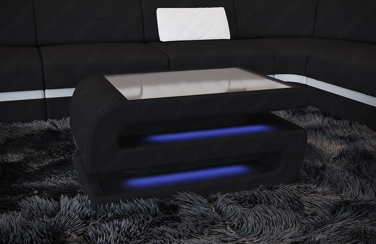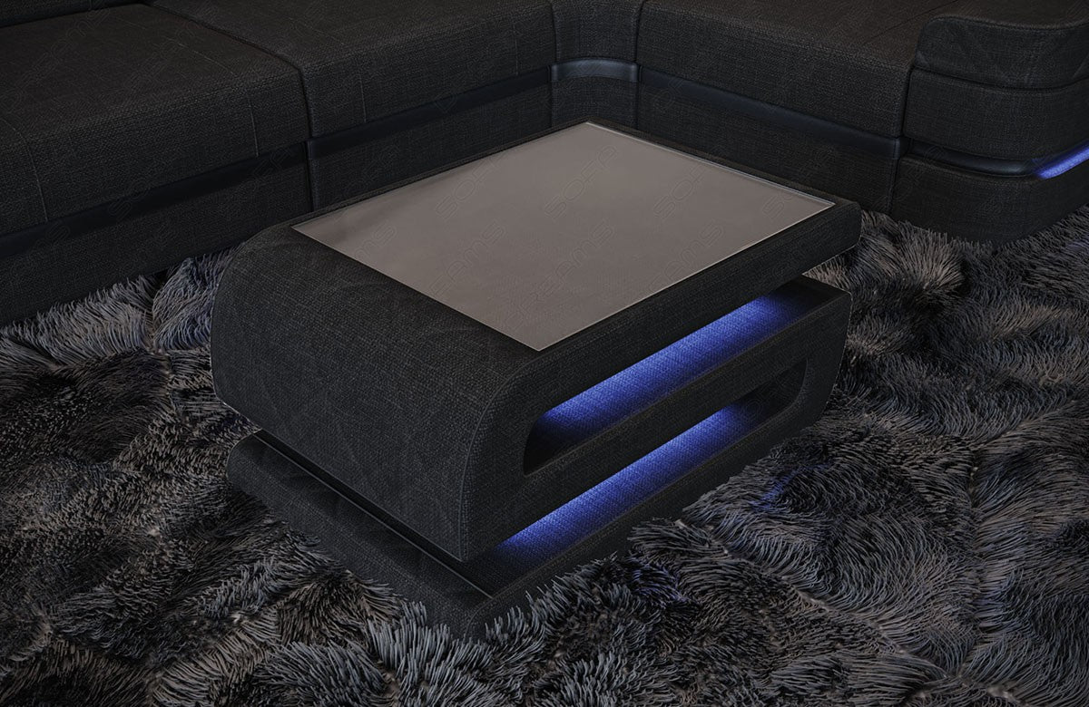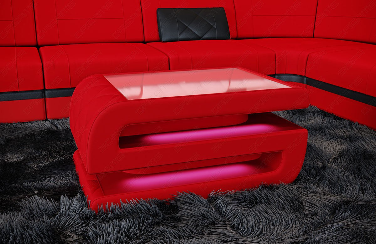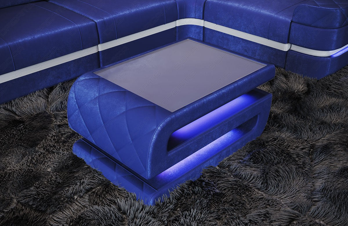 The Bologna upholstered coffee table (plain) is not only a perfect complement to the sofa of the same name, but also looks great in combination with other sofas and adds that certain something to any living room. The table's unusual design immediately draws attention. The elegance and modern shape of the coffee table make it a real eye-catcher. Upon request, the table can be equipped with LED lighting, which can be conveniently controlled with the included touch wheel remote control. With the LED lighting and the individually selected color, you can optimally showcase the table. The tabletop is made of 12 mm thick safety glass, so the table can also be used safely in households with children. The table's sturdy frame is made of robust, crack-resistant wood. The surface is particularly easy to maintain and clean. With a height of 45 cm, the Bologna coffee table offers the ideal size.
