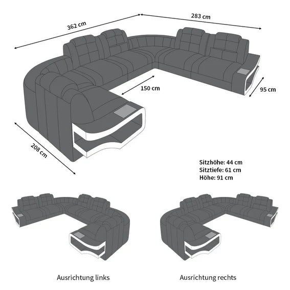The Naomi U-shaped leather living area with LED lighting will be a visual highlight in your living room. Particularly noteworthy is the large number of seats this sofa offers.