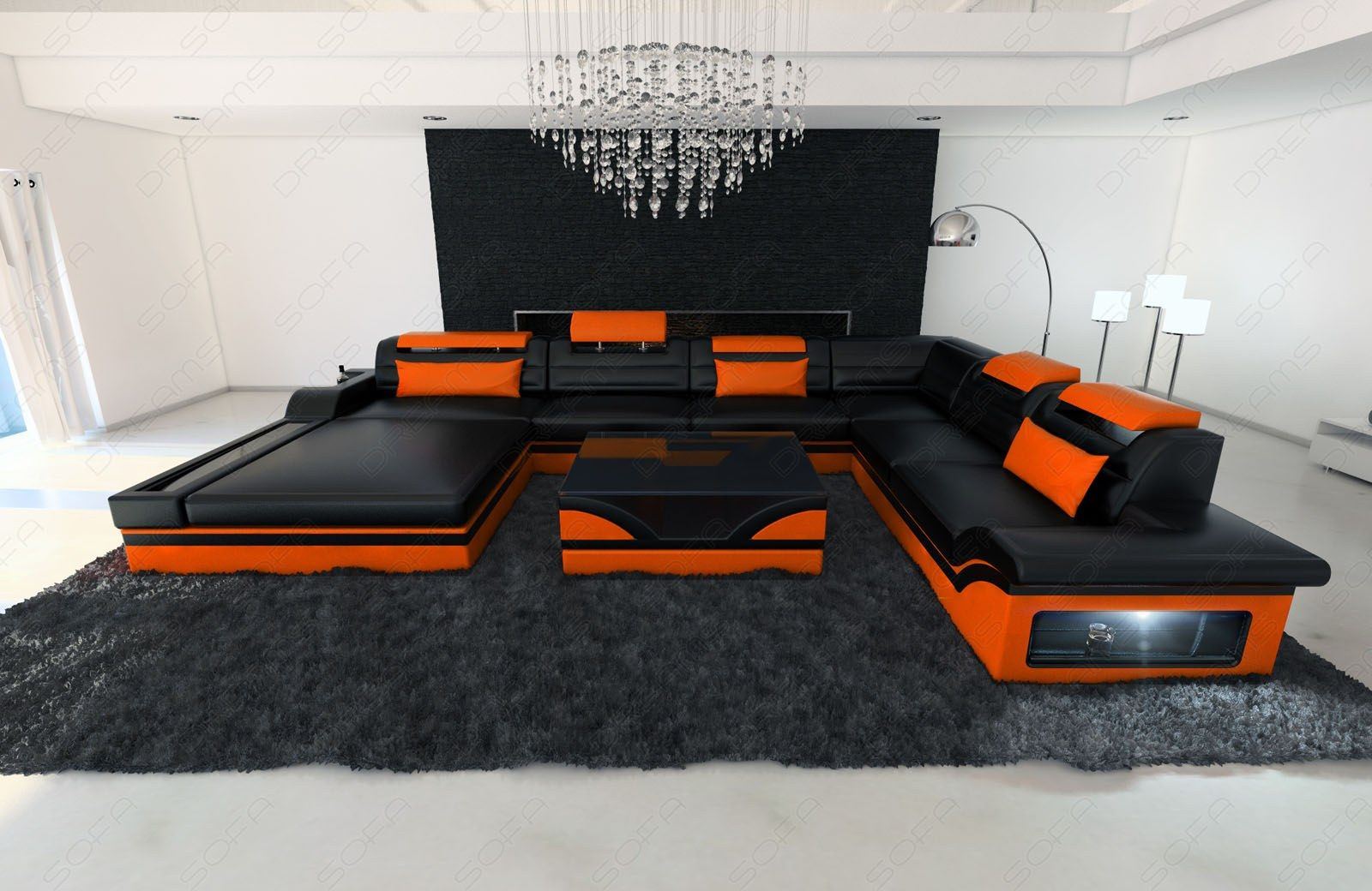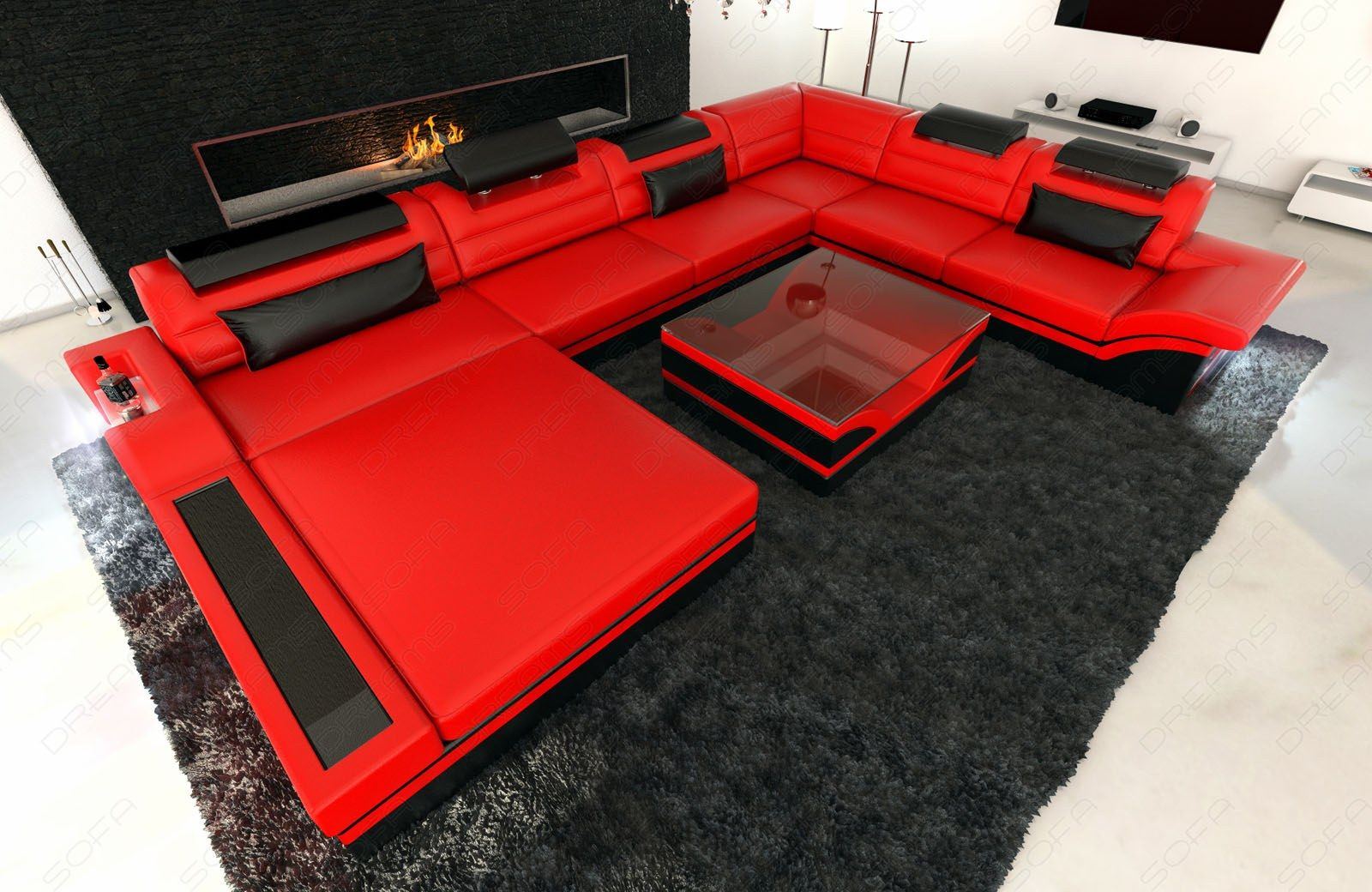 The 'Mezzo XXL' designer living area is the larger version of the Mezzo corner sofa. Those who prefer a more spacious layout will be perfectly served by the Mezzo XXL living area. This model is a modern leather corner sofa of the latest generation. Many innovative and practical functions have been integrated into the design. For example, the high-gloss shelves on the XL sleeping area and the illuminated storage area are special features that are rarely found in this form in leather sofas or living areas. The elegantly curved armrests with integrated LED lighting and the new multifunctional headrests perfectly round off the overall concept of this designer couch. The headrests can be individually adjusted in both height and angle to maximize personal comfort. This allows you to experience a unique seating experience and the highest level of comfort. This designer couch fulfills all your wishes and, in addition to the generous reclining surface, also offers additional seating for cozy evenings with the family. The armrest also features integrated LED lighting, which creates a special atmosphere in various colors as desired, all while consuming minimal power. A perfect alternative to conventional living room lighting that completely transforms the ambience.