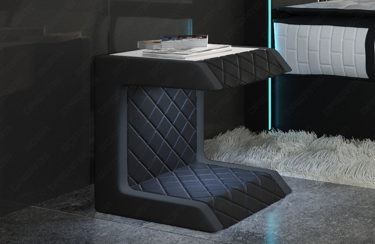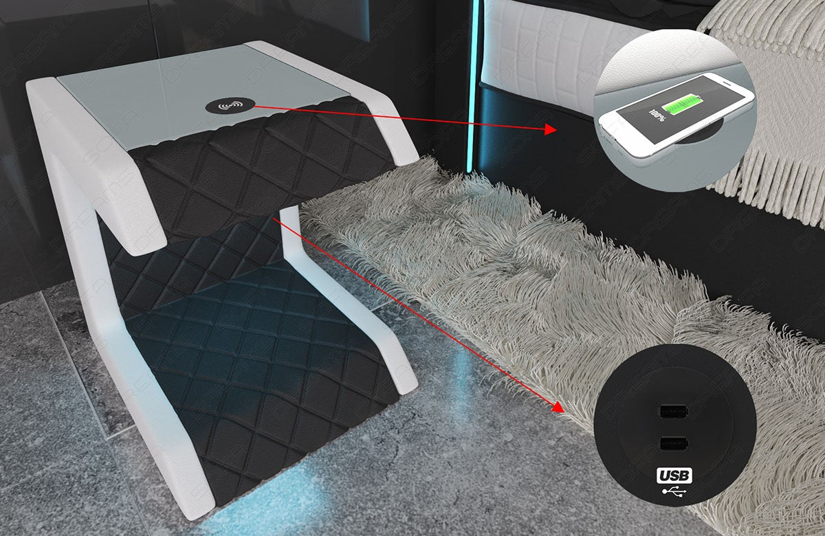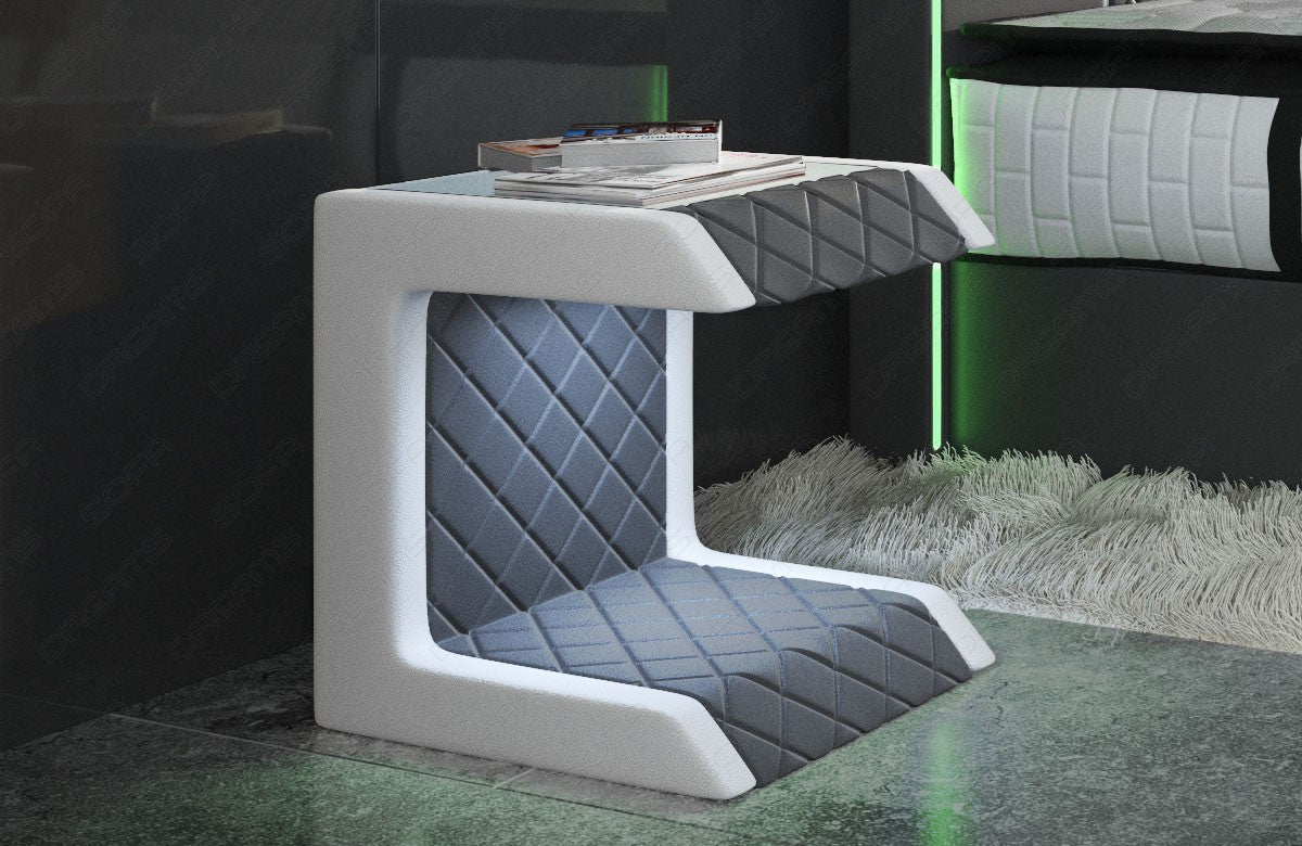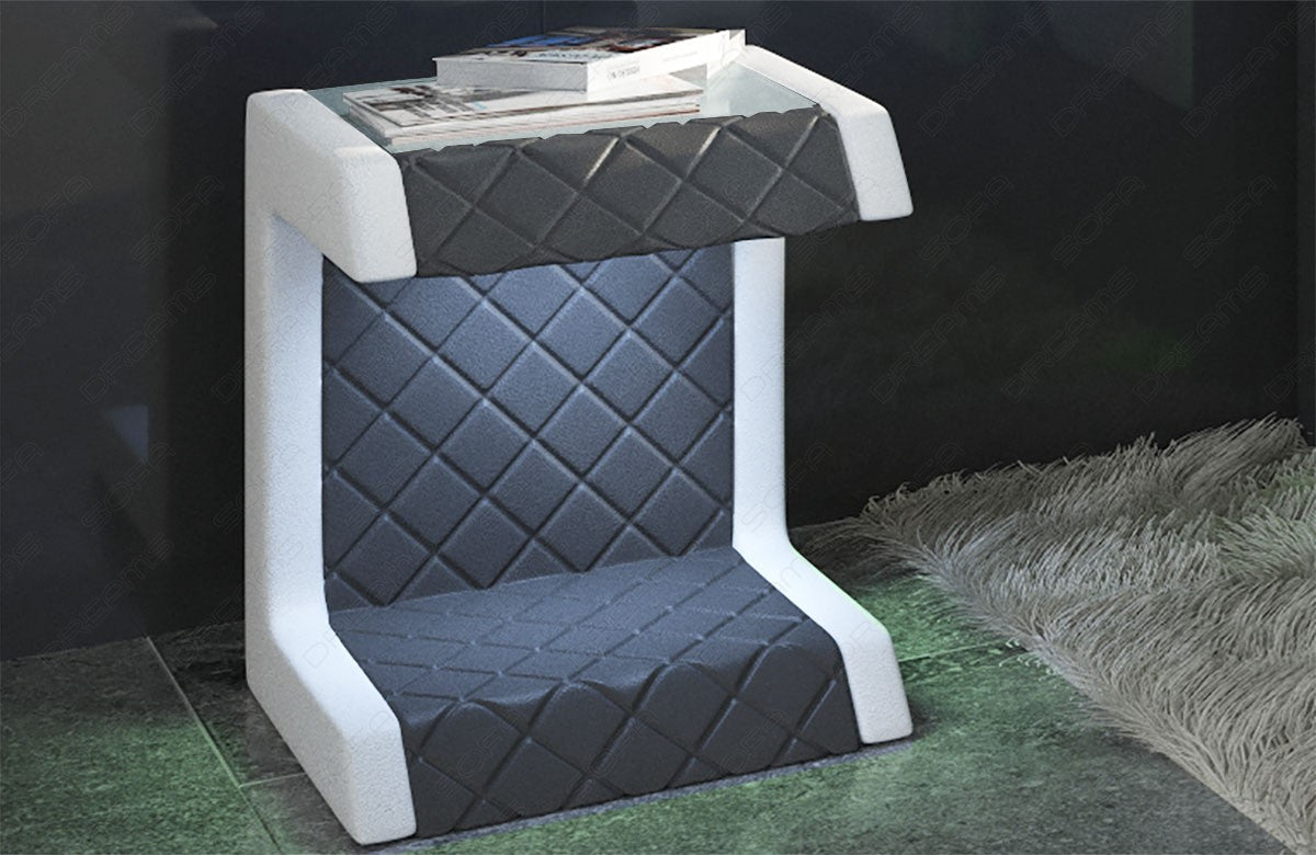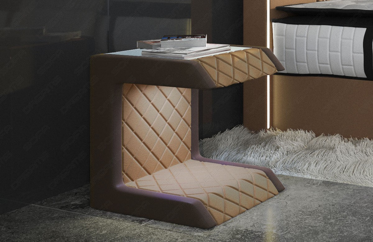 The bedside table from the Paris series, like the matching bed, stands out with its striking Chesterfield design. The optionally integrated LED lighting illuminates your bedroom and simultaneously emphasizes the elegant design of the side table. Thanks to its sophisticated construction, the table offers ample storage space for your personal belongings. The robust frosted glass tabletop completes the overall look of the furniture. As a special technical feature, the bedside table can be equipped with an induction charging surface for your cell phone and two USB ports for conveniently charging additional devices.