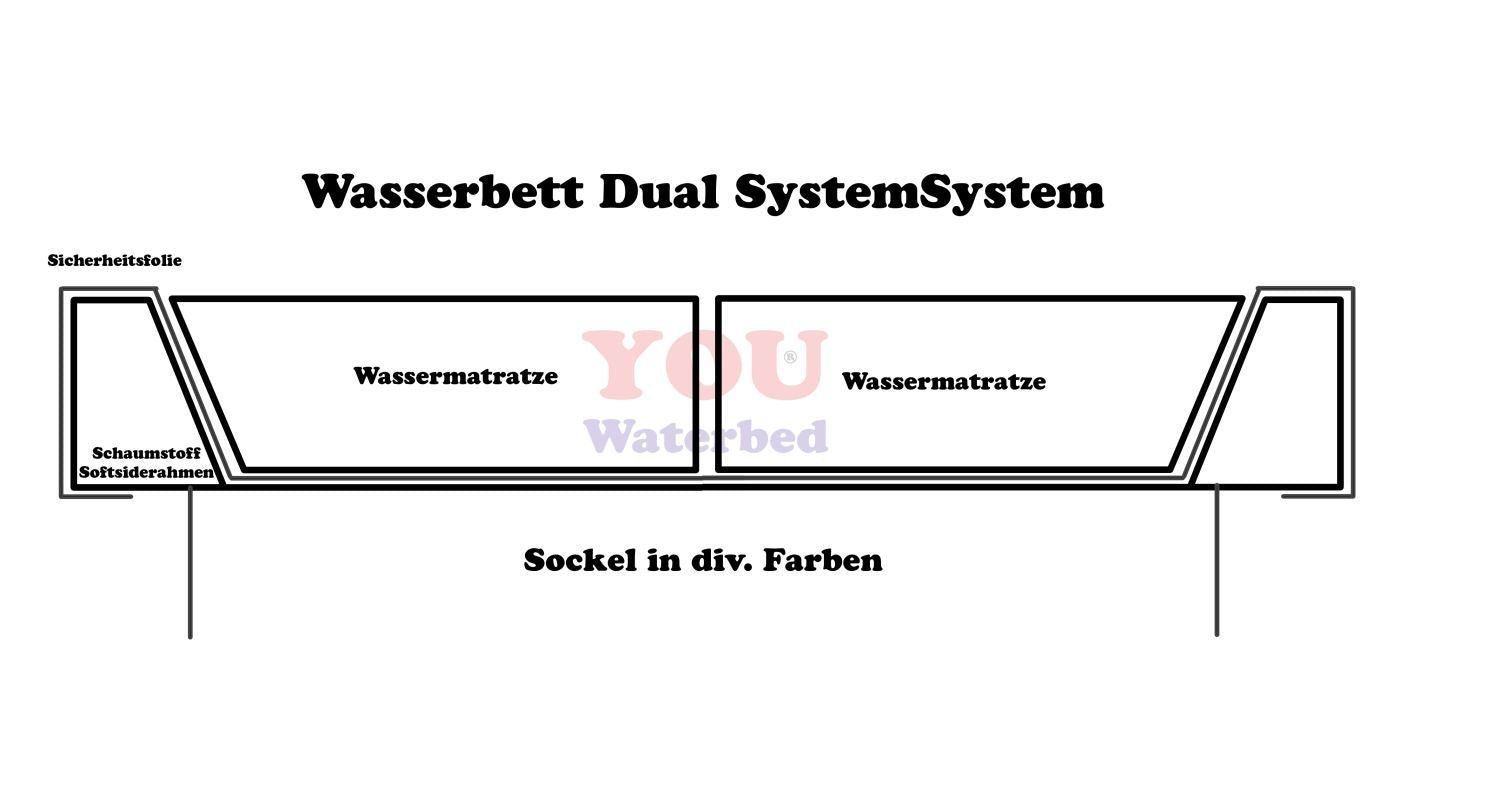 Do you want to be lulled to sleep by gentle waves? The Frankfurt waterbed, with its elegant, curved shape, evokes associations with the sea – without any rocking. This radiance brings a holiday feeling into your bedroom all year round. You can enhance this feeling by choosing your preferred color combination. Why not add a stylish accent with a black and red bed? Would you prefer more subtle colors, yet still a touch of color in the evening? The integrated LED lighting on both sides of the bed offers a color change and can be adjusted to your liking to create an atmospherically lit bedroom.