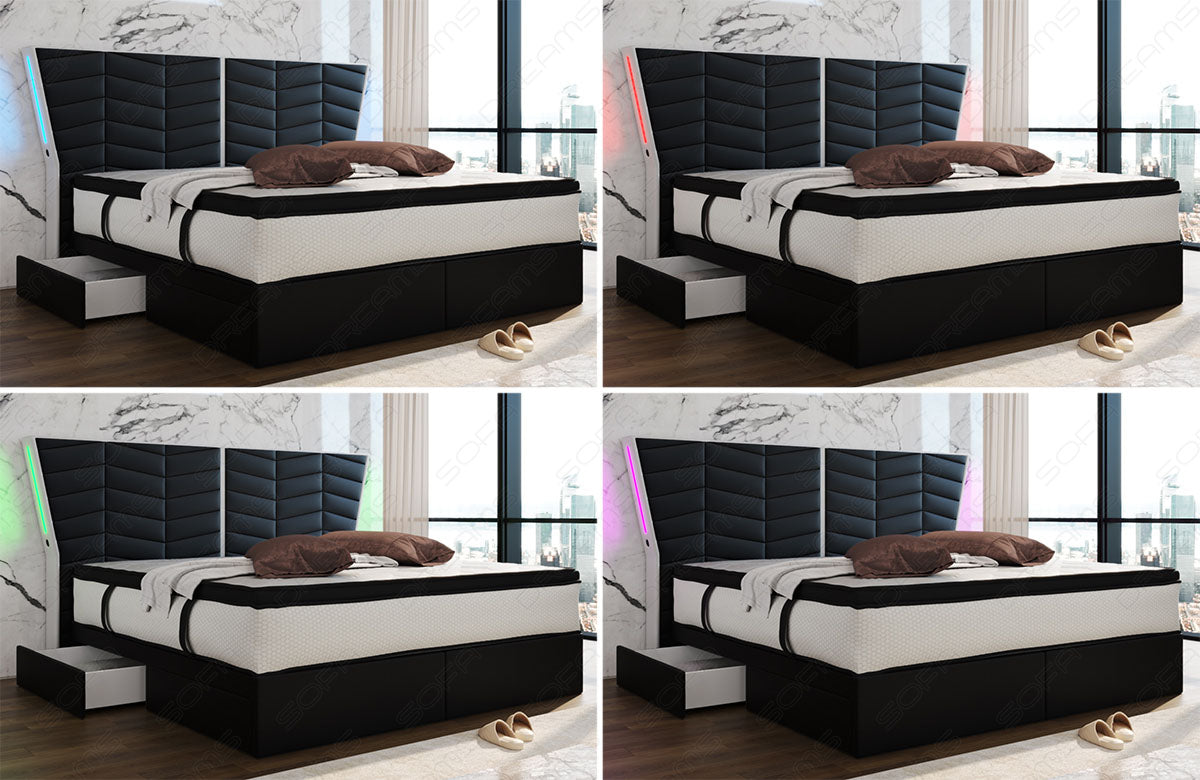 The Novara box spring bed impresses with its unique, modern design. The impressive headboard impresses with its size, with side panels and elaborate quilting. Integrated LED lighting on the sides of the headboard creates a pleasant atmosphere in the bedroom with its color changes. The bed offers practical storage space with 4 spacious drawers. To open the drawers on each side, additional space is required according to the information in the table. The bed frame is made of sturdy beechwood, which is particularly resistant to cracking. The deluxe mattress has a firmness level of H3 (medium firm) and is equipped with a barrel-shaped pocket spring core that provides targeted support. The mattress cover is made of breathable knit fabric. The 7 cm high topper is made of viscoelastic foam and comfort foam, which is moisture-regulating and breathable. The cover is available in various leather types: high-quality synthetic leather, genuine leather, and exclusive buffalo leather. The accent color is used for the design of the side panels of the headboard. Optionally, you can add two practical USB ports in the headboard.