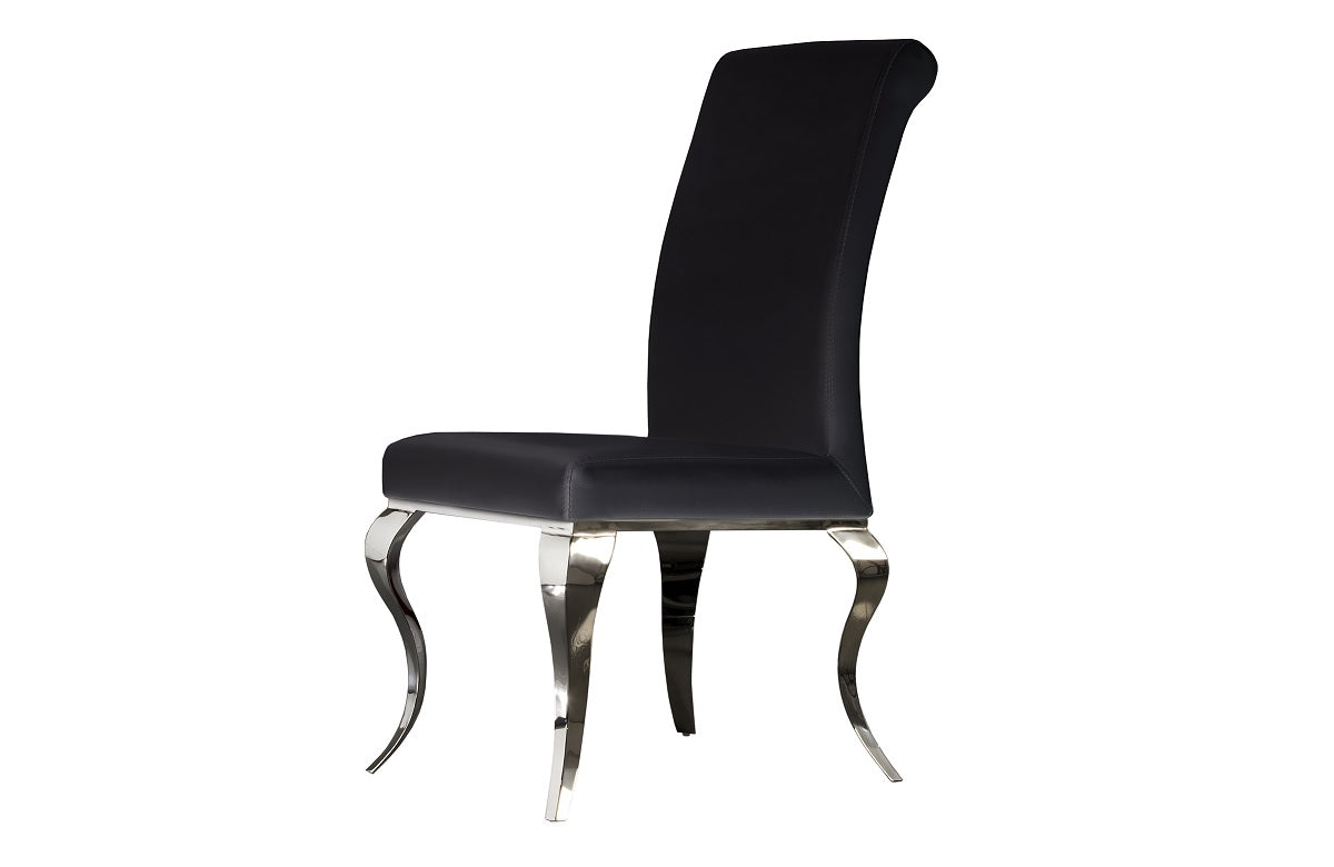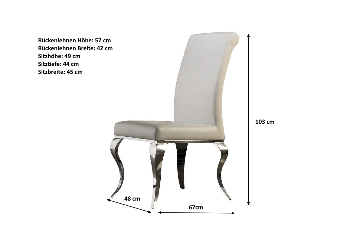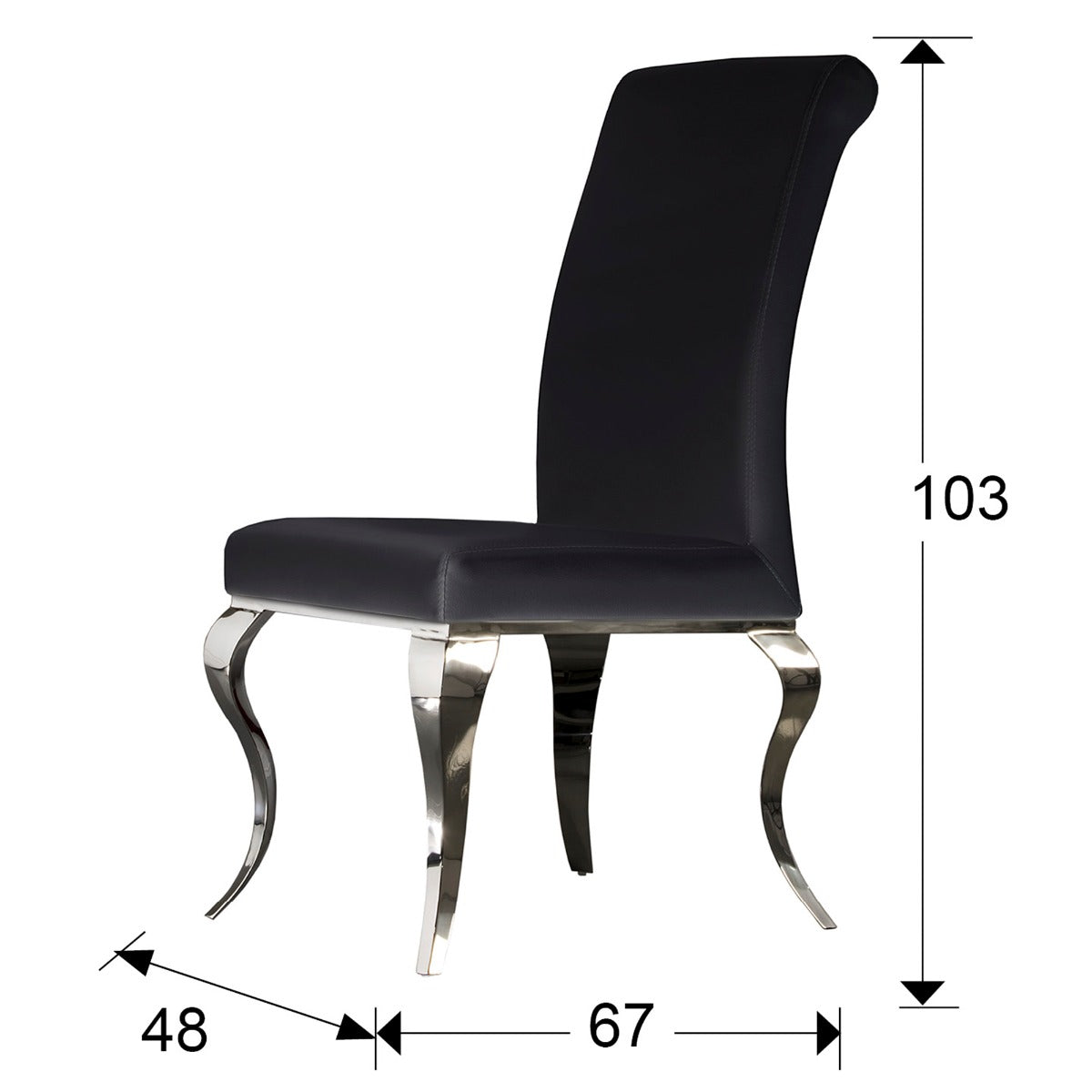 In its black version, this Elegance dining chair is particularly stylish. The high-quality Barroque chair offers a modern alternative to standard chairs from traditional furniture stores. The curved legs give it a unique look that you'll be happy to present to your guests. The feet are made of polished, stainless steel and help create a cozy and inviting atmosphere in the dining area. The chair features comfortable faux leather upholstery. With a height of 103 cm, a depth of 67 cm, and a width of 48 cm, it's the perfect size for the matching Barroque dining table. You can also find a matching coffee table in the same design in our online shop. With such a stylish dining room chair, a cozy evening in the dining room or kitchen is sure to come in no time!