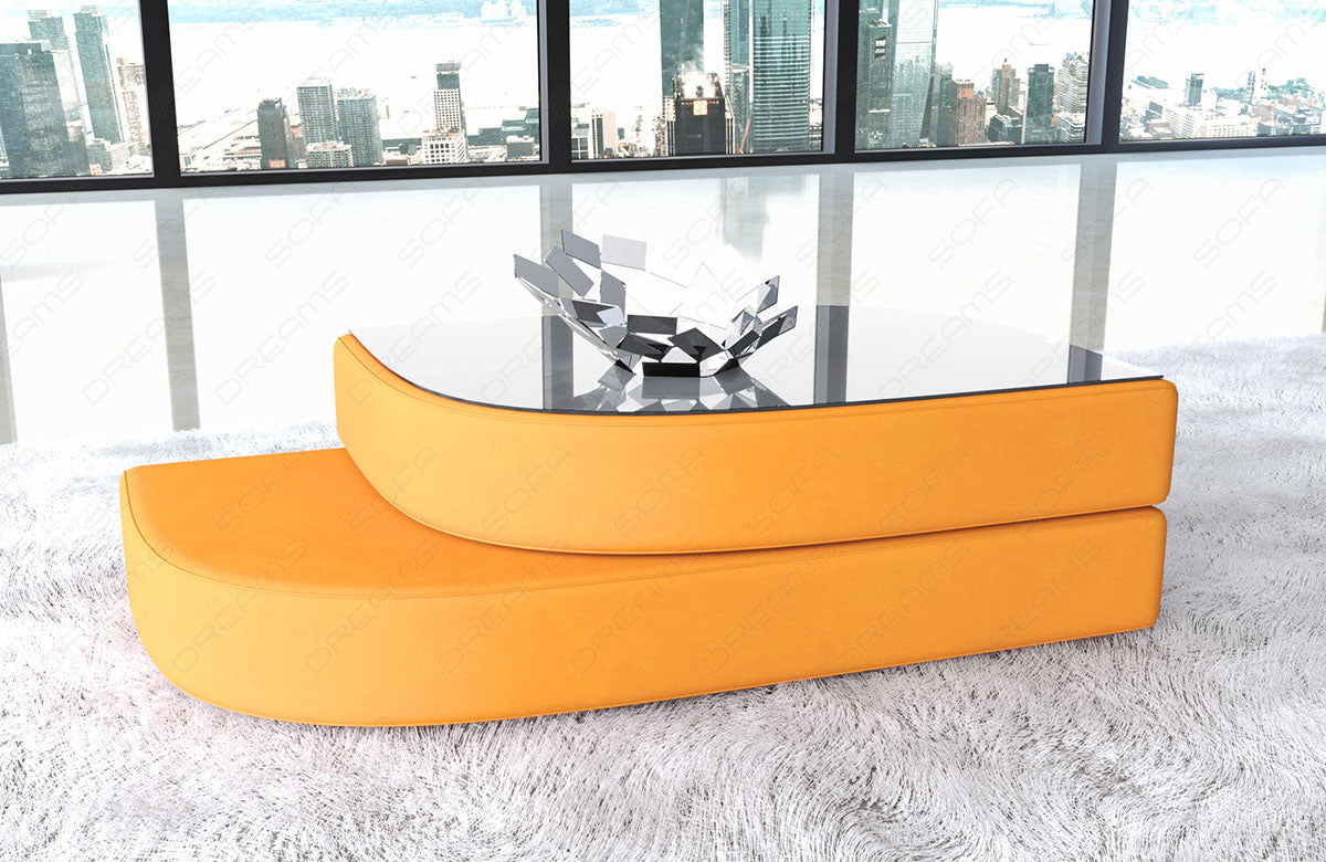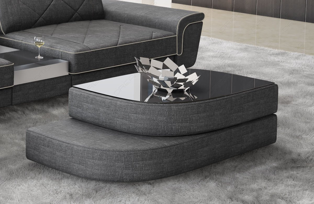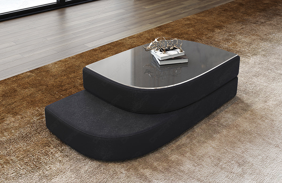 The modern Lari coffee table, featuring an Elegancen fabric cover and a glass top, is the ideal complement to your Lari sofa. Its innovative design and unique shape will draw attention in your living room. The table impresses with its modern aesthetics and stable construction. The robust wooden frame is particularly resistant to cracks. The tabletop is made of 12 mm thick safety glass and is particularly easy to clean. With a height of 45 cm, the table is the perfect size.