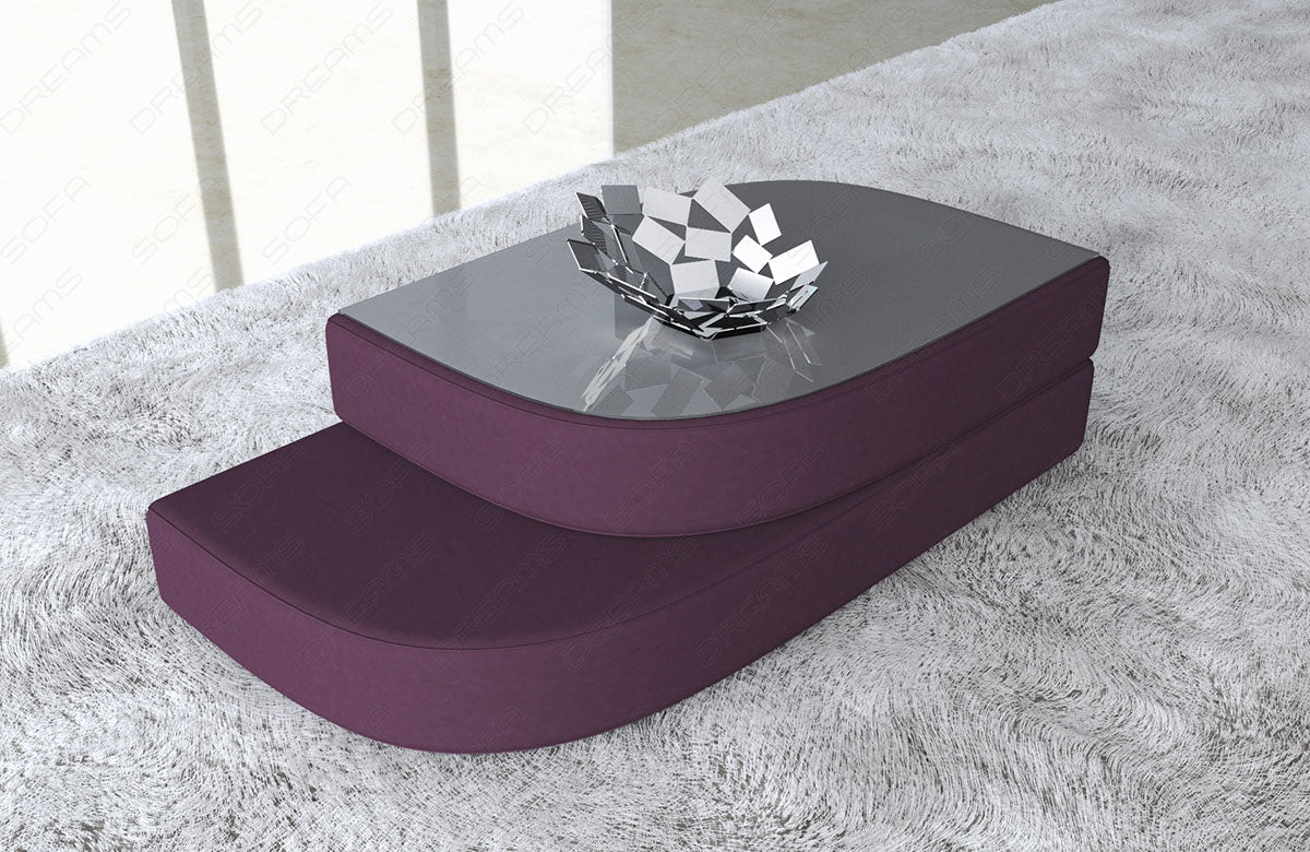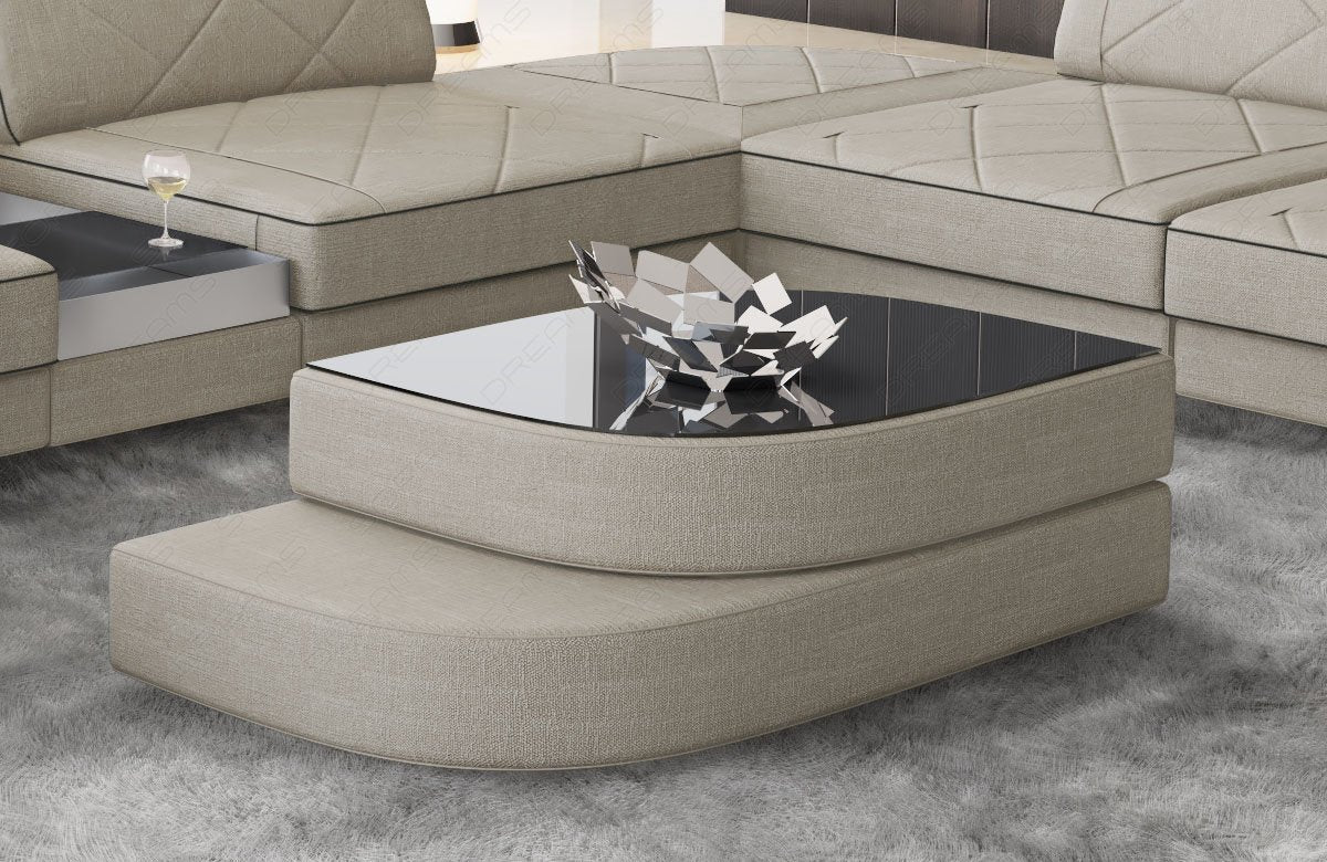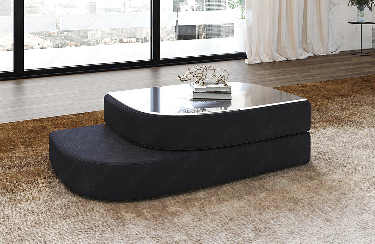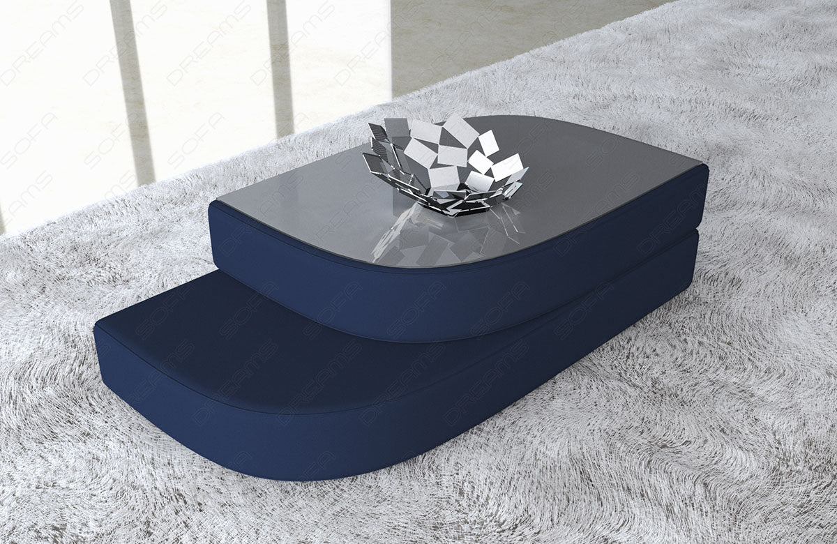The modern Lari coffee table, featuring an Elegancen fabric cover and a glass top, is the ideal complement to your Lari sofa. Its innovative design and unique shape will draw attention in your living room. The table impresses with its modern aesthetics and stable construction. The robust wooden frame is particularly resistant to cracks. The tabletop is made of 12 mm thick safety glass and is particularly easy to clean. With a height of 45 cm, the table is the perfect size.