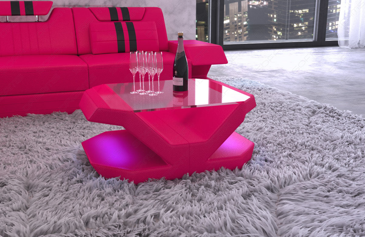 Our stylish Venezia coffee table, equipped with a leather cover and a safety glass top, not only offers a practical storage area but also becomes a visual highlight in your living room. The table impresses with its modern design and optional LED lighting.