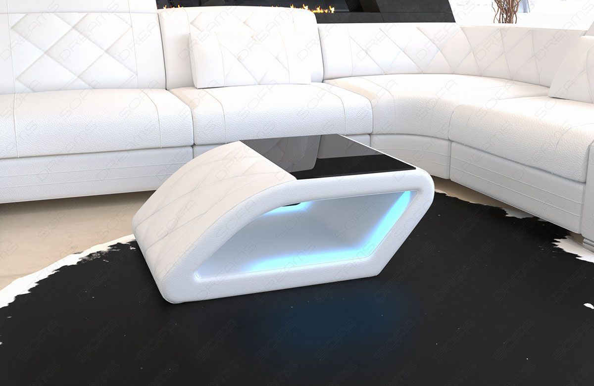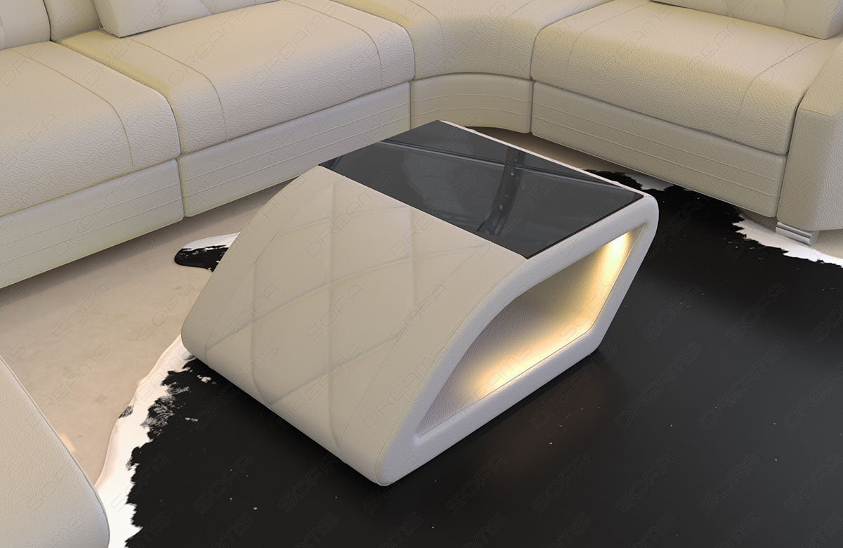 The Comfort coffee table impresses with its elegance, rounded shapes, and striking Chesterfield quilting, which also characterize the matching sofas. Combined with the modern black glass tabletop, the designer table takes on a particularly contemporary appearance and becomes a real eye-catcher in any living room. Thanks to the optional LED lighting, the aesthetics of this table are further enhanced. The Comfort table is available in three different types of leather: buffalo leather, artificial leather, and genuine leather, as well as a combination of artificial and genuine leather.