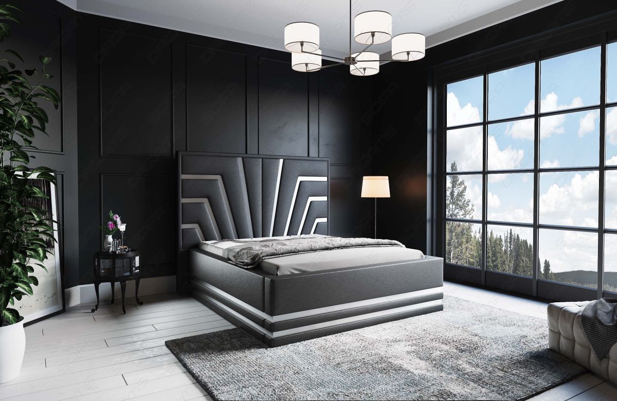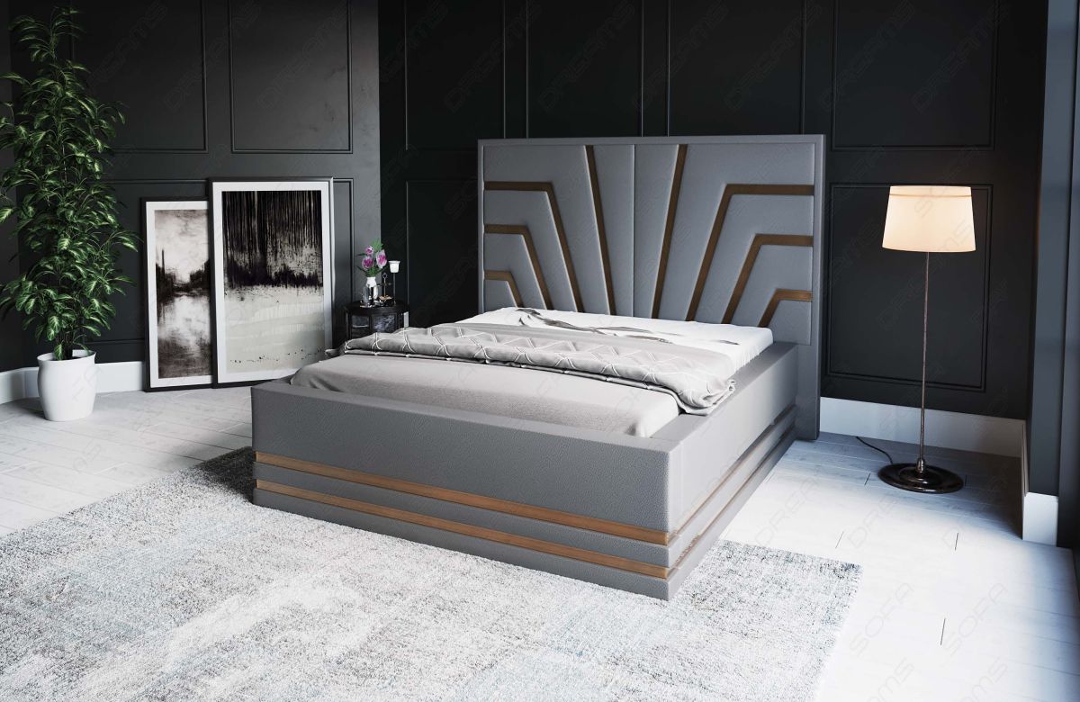 The Cecina complete bed combines modern design with luxurious features. The special appeal of this model is achieved by the eight decorative moldings in the headboard and two in the body. These moldings, made of MDF material with a special glaze, can be selected in the accent colors gold or silver. The body and headboard of the bed are covered in the desired main color with artificial leather, which has a fine leather grain and a soft textile backing. The artificial leather offers skin-friendly properties and is UV-resistant.
