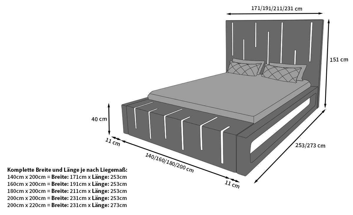 A mattress and slatted frame are not included as standard with this bed. However, you can choose from the drop-down menu whether you would like to add a slatted frame or a slatted frame with mattress to this designer bed. The size is automatically adjusted to the sleeping position you selected.