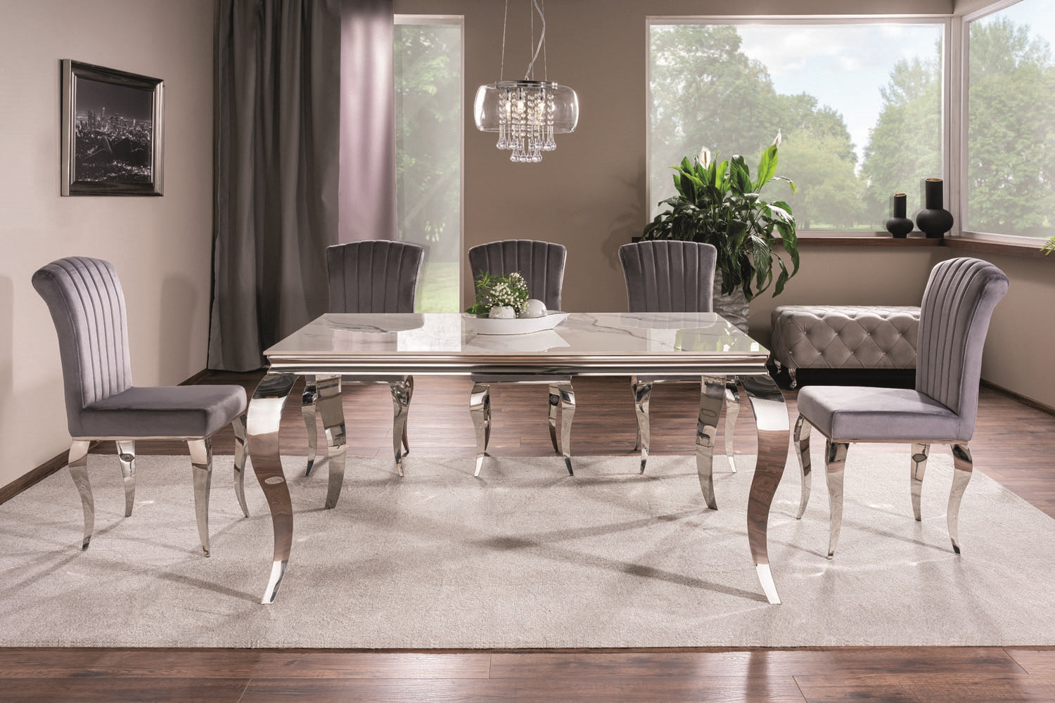 Frame: The frame of the dining table is made of stainless steel, which ensures high stability while offering a modern, timeless aesthetic. The color combination of white and chrome gives the table an elegant and sophisticated appearance.