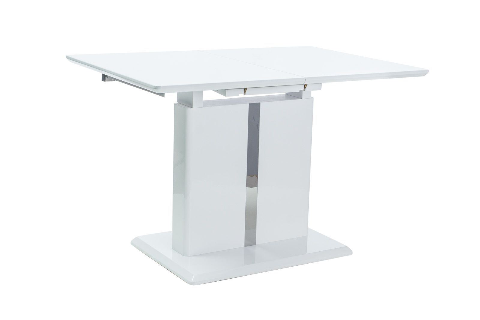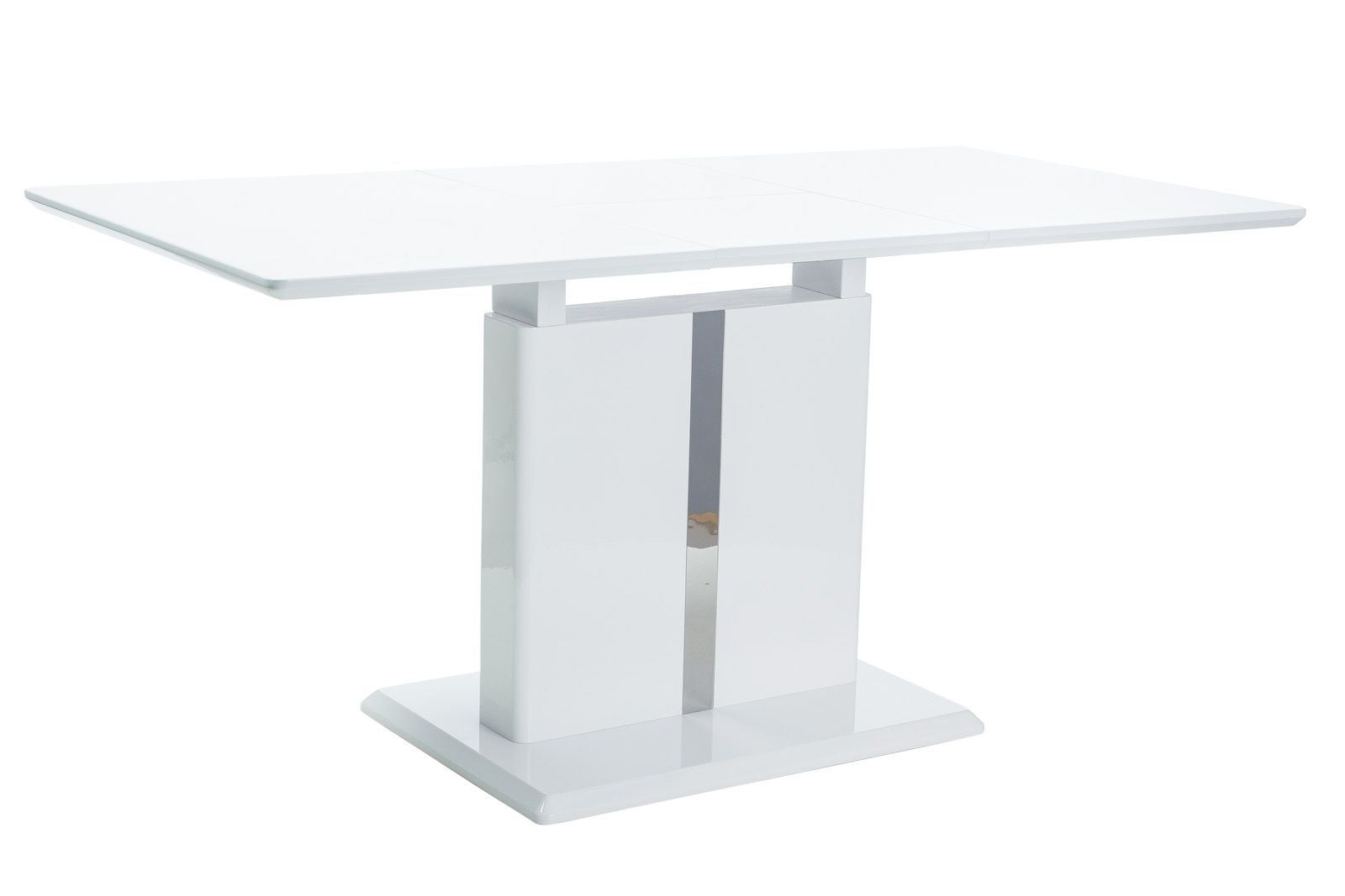 The Lucca dining table impresses with its elegant white tabletop and matching white table leg. The design is consistently glossy and simple, allowing it to be easily integrated into any home. Metallic accents in the middle section of the table leg further emphasize the sophistication of this table.