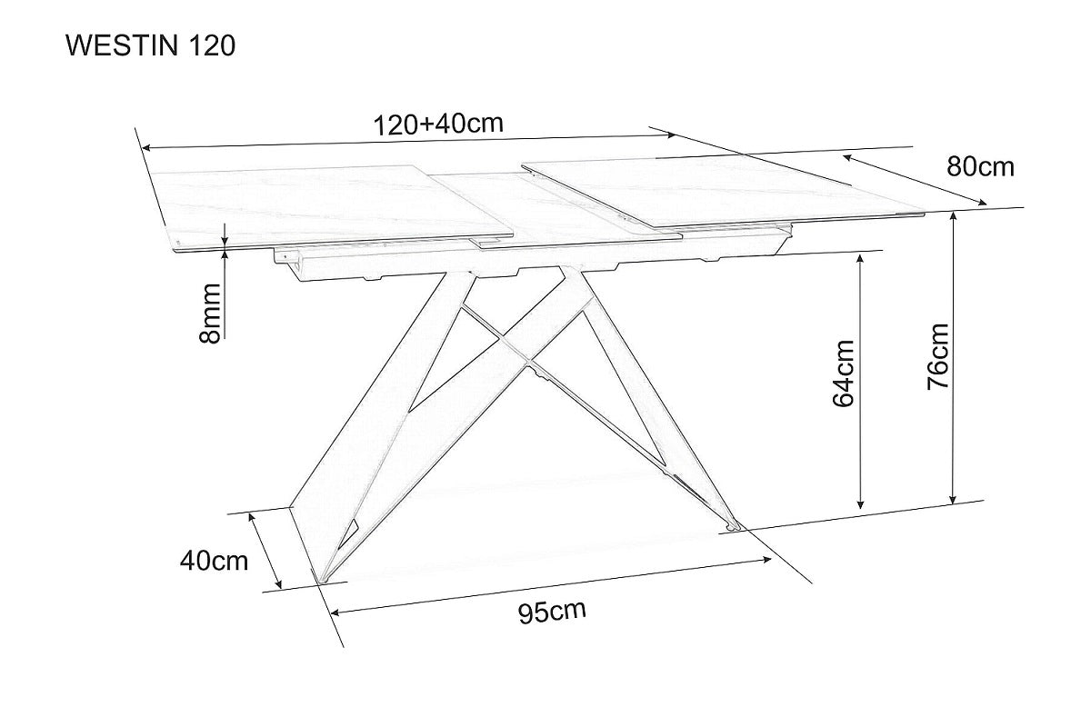 Width: 120 cm, extendable up to 160 cm x Height: 76 cm x Depth: 80 cm