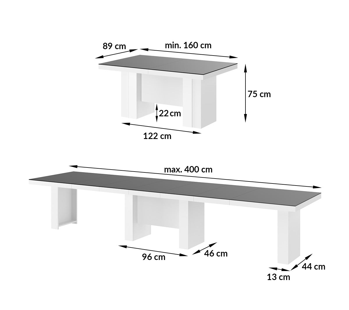 Width: 160 cm - extendable to 208 cm, 256 cm, 304 cm, 352 cm and 400 cm x Height: 75 cm x Depth: 89 cm