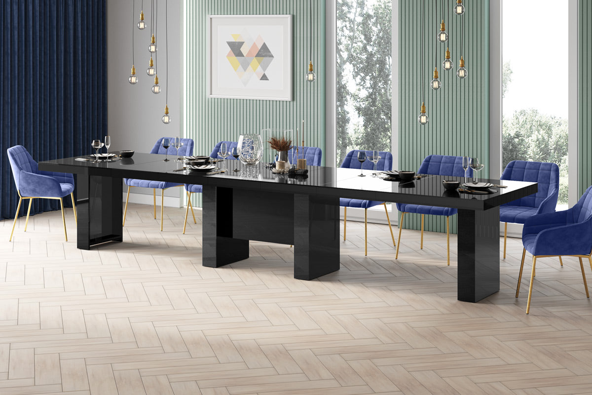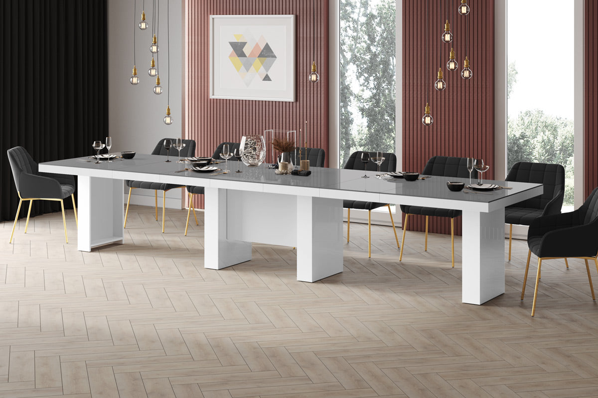 The Largo dining table in high-gloss finish impresses with its modern design. With a high-quality synchronous guide and five special inserts under the tabletop, the table can be extended up to 400 cm as needed to create space for more guests. Thanks to a variety of color combinations, the table can be used in modern living rooms, dining rooms, and conference rooms.