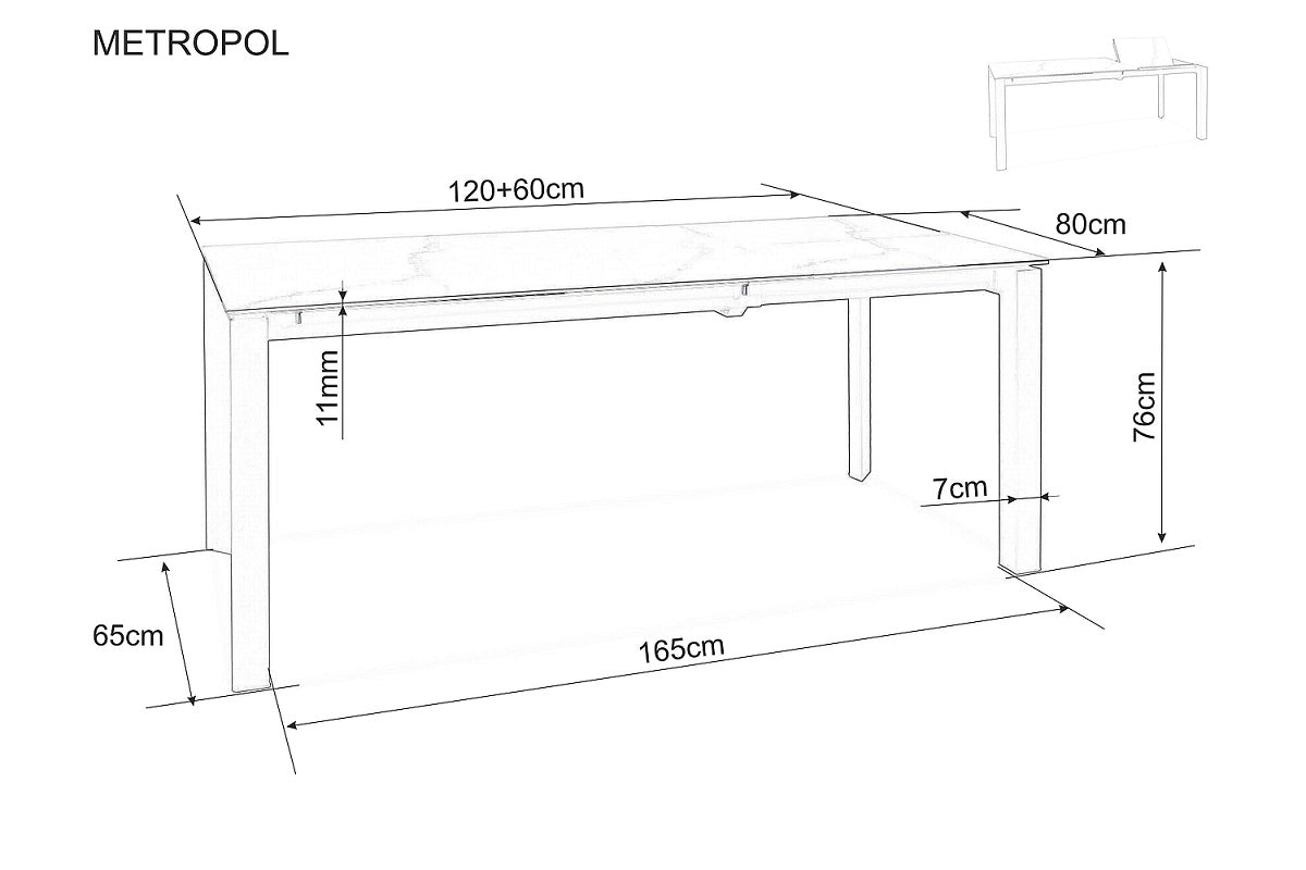 Width: 120 cm, extendable up to 180 cm x Height: 76 cm x Depth: 80 cm