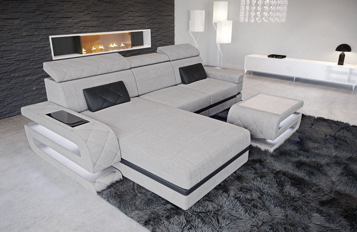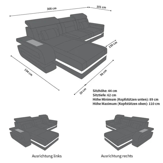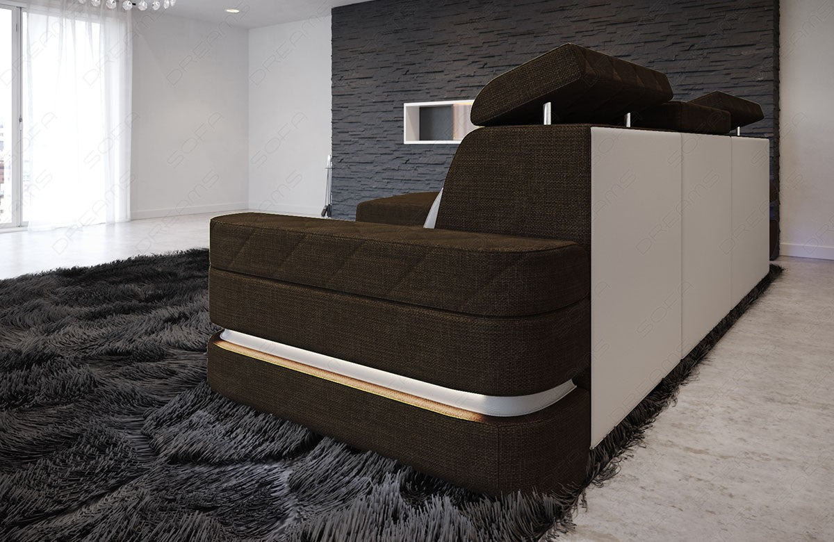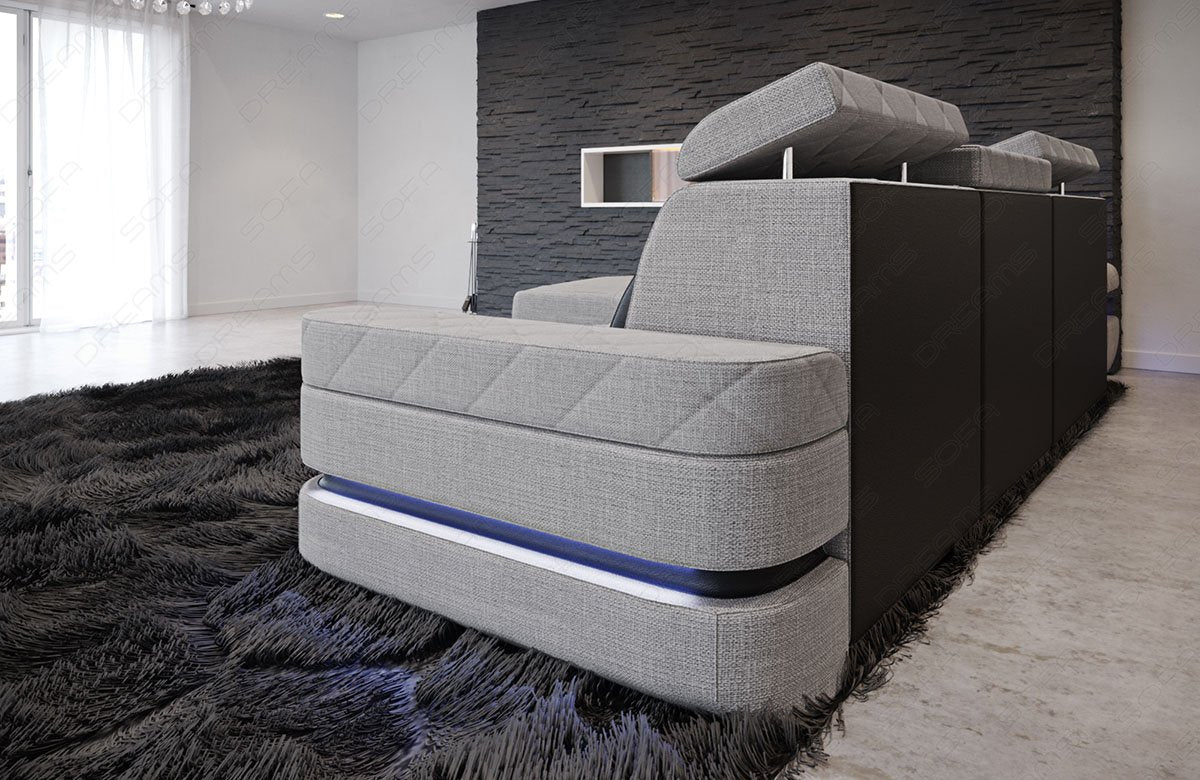The upholstered sofa Bologna offers generous space and superior comfort. With adjustable LED lighting, you can illuminate the sofa in different colors to suit your mood. The fabric sofa is available in three different fabrics and a variety of colors, allowing you to create your perfect sofa. The Elegance quilting on the armrests, cushions, and headrests is particularly striking. A folding armrest with practical storage space is also included. Optionally, the sofa can be expanded with additional features such as a USB port or a sleeping area. Additional extras such as a relaxation function or a beverage cooler are available under accessories.