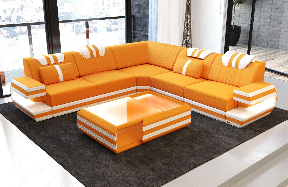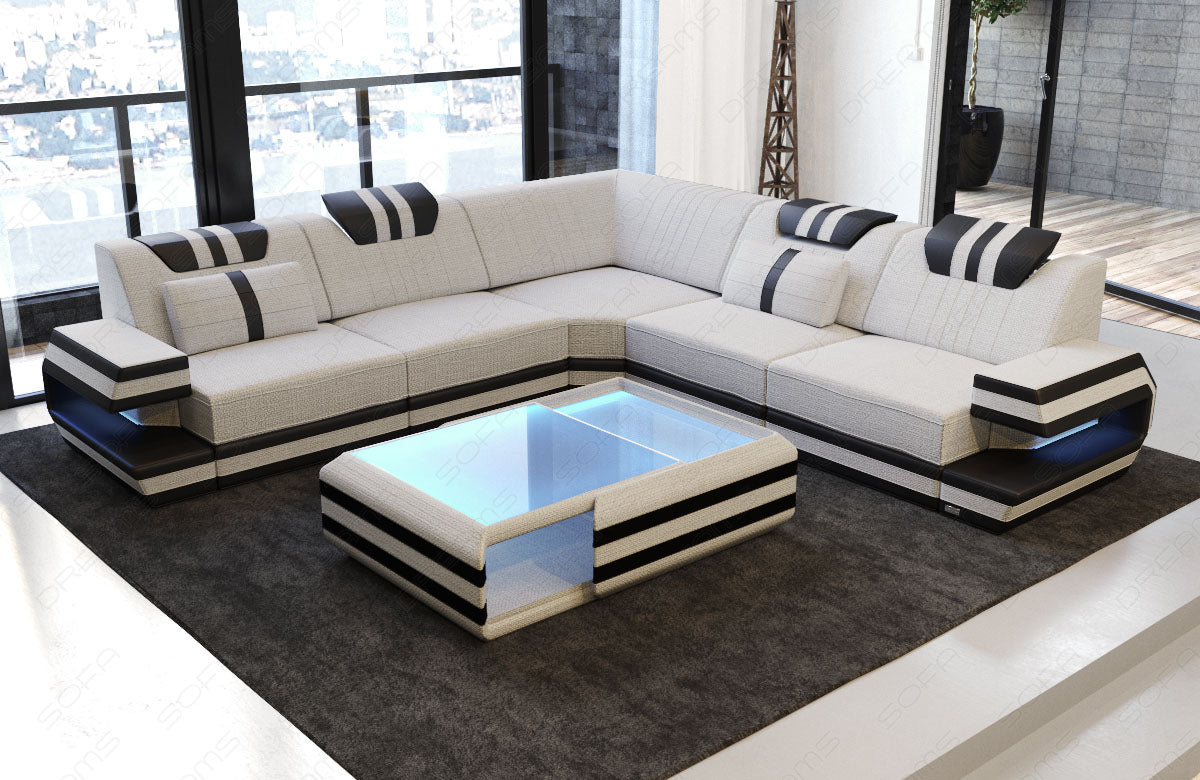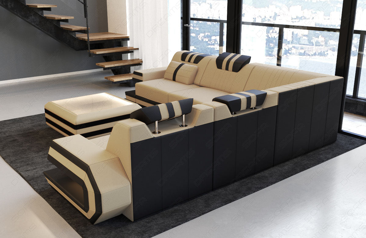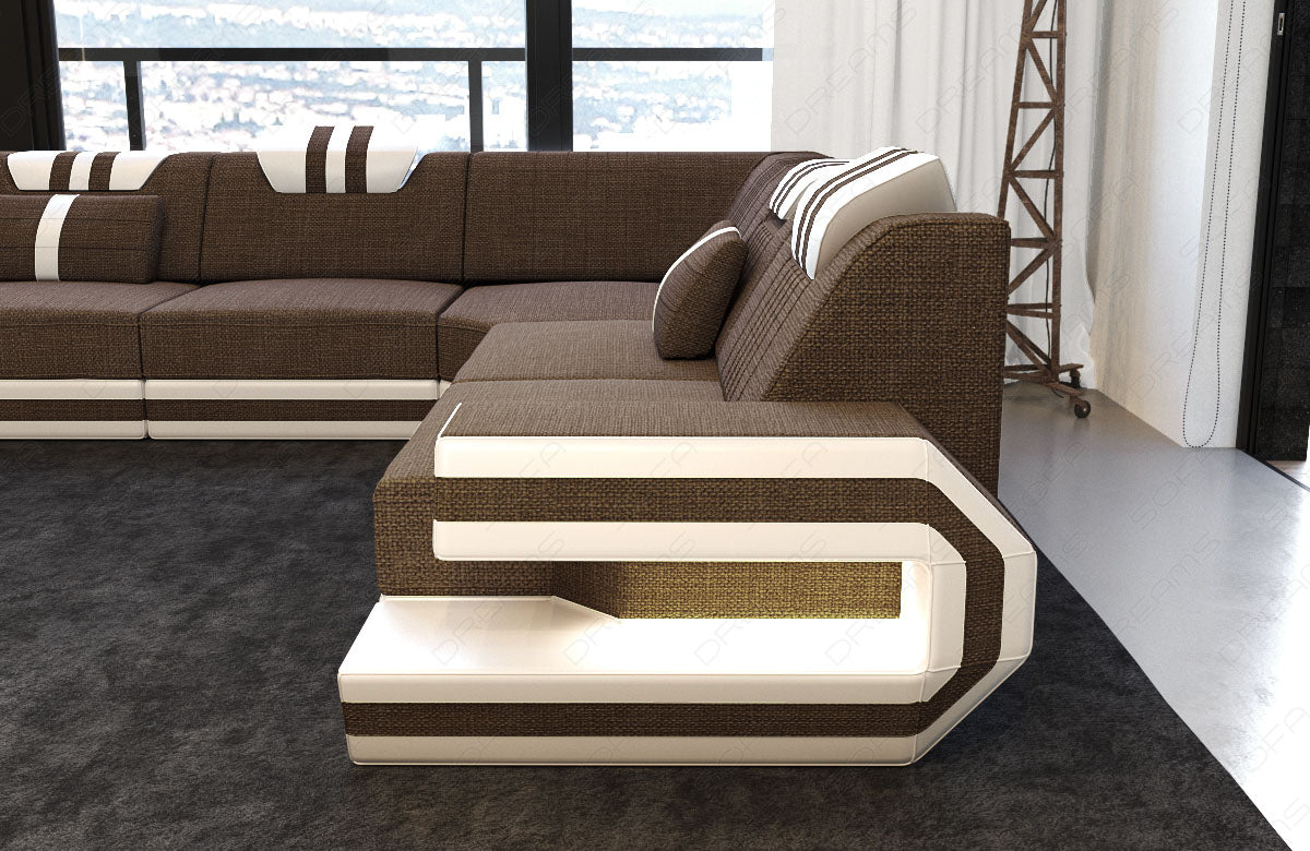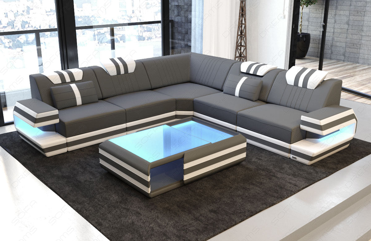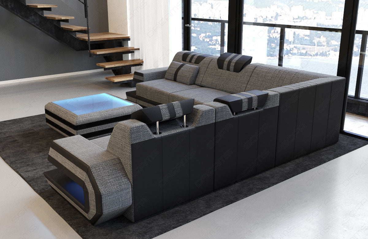 The Devolo corner couch meets modern standards in every respect. While the unusually shaped armrest and trendy striped design attract attention, the living area also offers many practical extras. These include color-changing LED lighting on both sides. The storage space integrated into the frame and the Elegance high-gloss shelves offer space for things you always want to have close at hand. Opt for additional features such as the recliner function, an additional box with cooling cup holders, or a USB port.