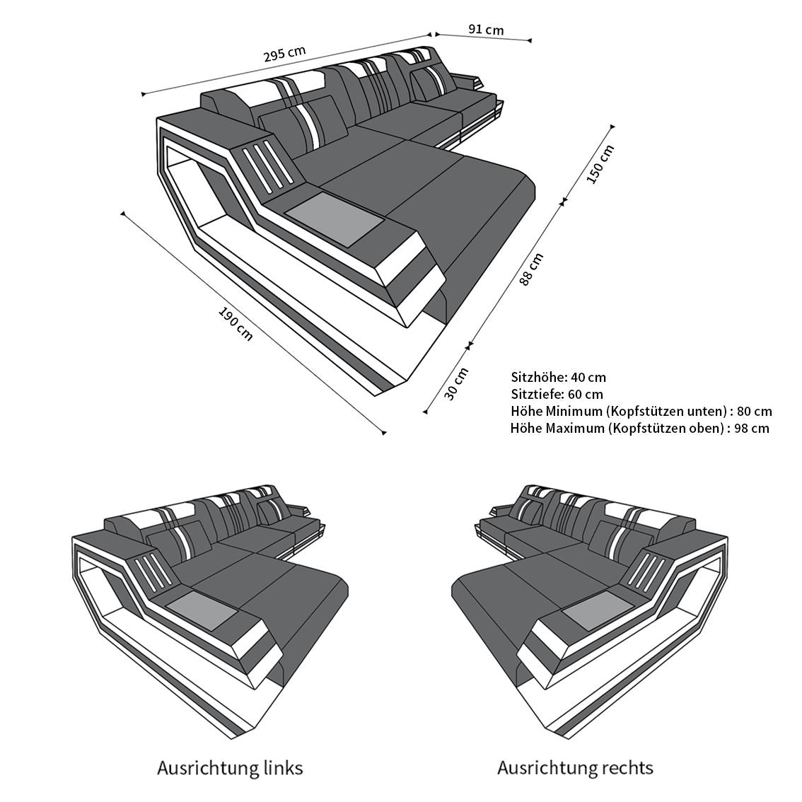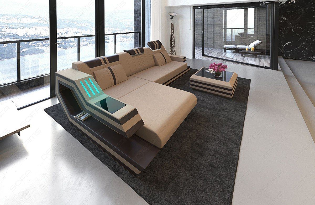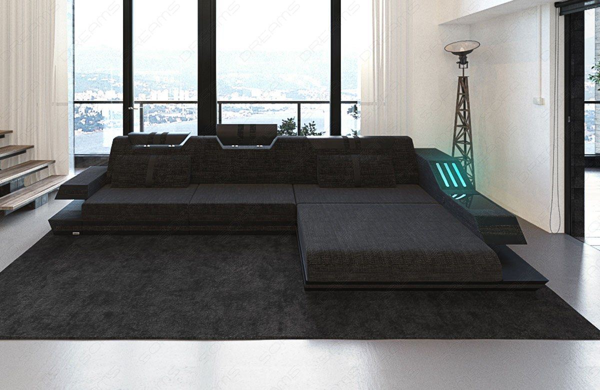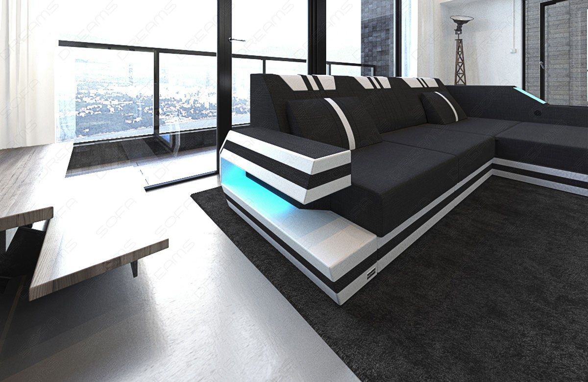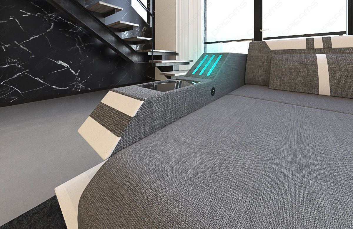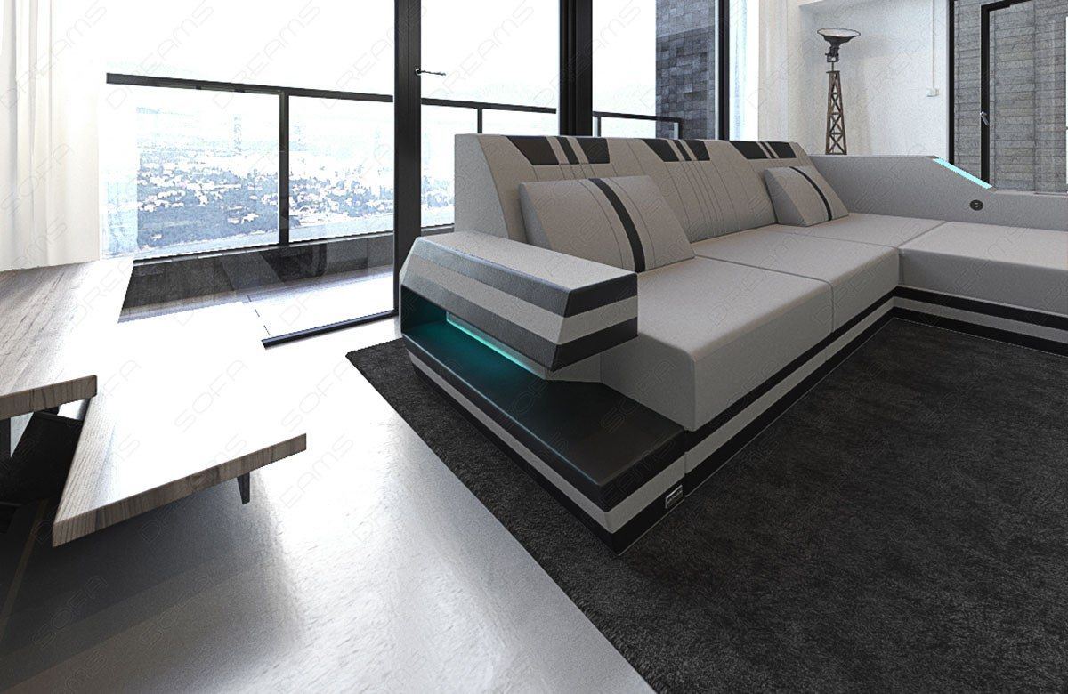 The Rodeo corner sofa meets modern demands in every respect. While the extravagant shape of the armrest and the trendy striped design attract attention, the sofa also offers numerous extras. These include color-changing LED lighting on both armrests. The designer sofa also has an optional USB port (if selected) so you can conveniently charge your tablet or laptop without having to get up. The storage space integrated into the frame and the Elegance high-gloss shelves offer space for things you like to have close at hand. Is the only thing missing a guest bed? Order the Rodeo sofa with a practical sleeping function!