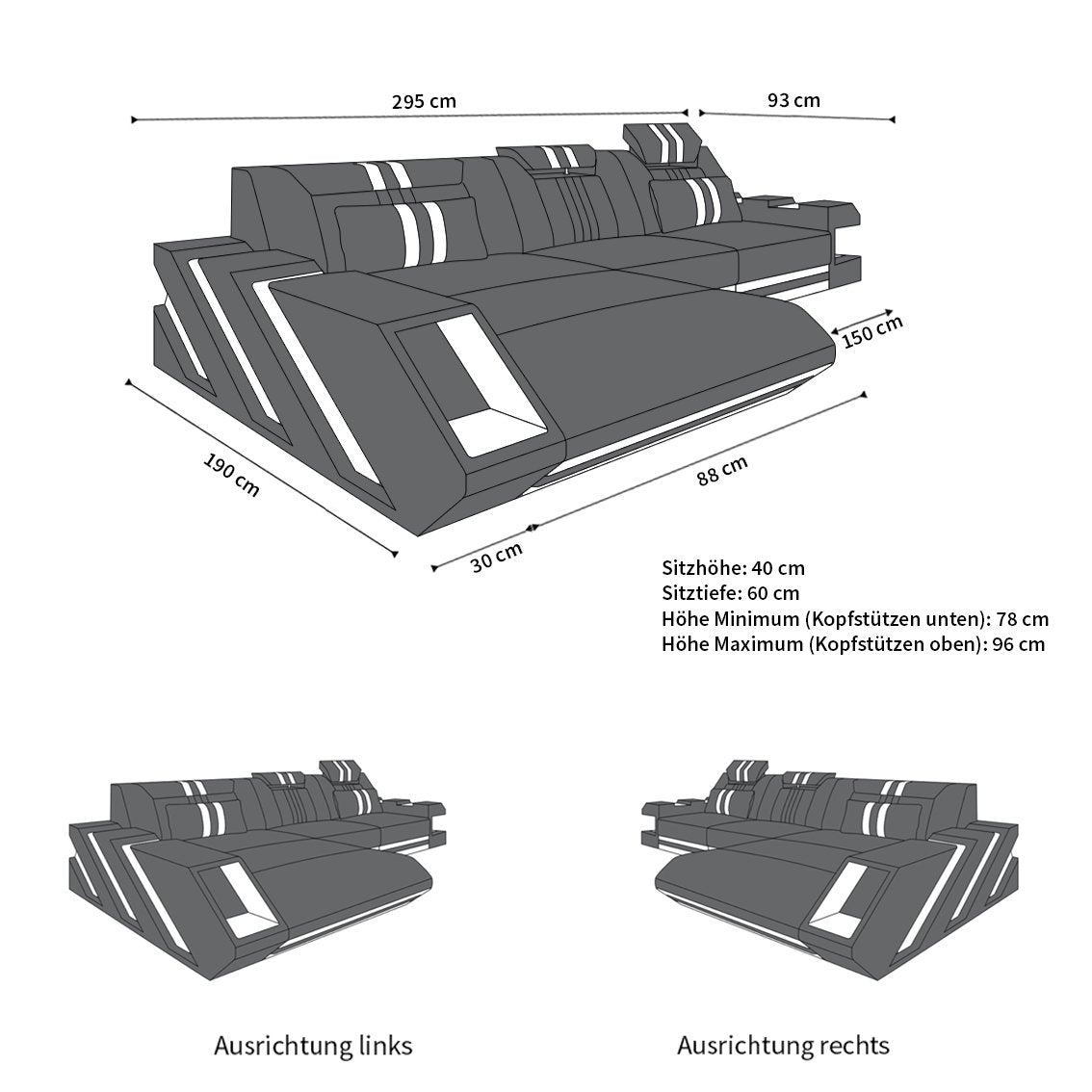 The L-shaped Apollo sofa offers pure luxury and plenty of space to sit and relax. A particularly striking feature are the stylishly designed armrests, which not only provide additional storage space but are also equipped with LED lighting. This can be set to various colors – a simple movement of the included touch-wheel remote control is enough to immerse the sofa in a calming blue or an atmospheric violet. Furthermore, you will find a practical USB port in one armrest, ideal for charging your laptop or smartphone.