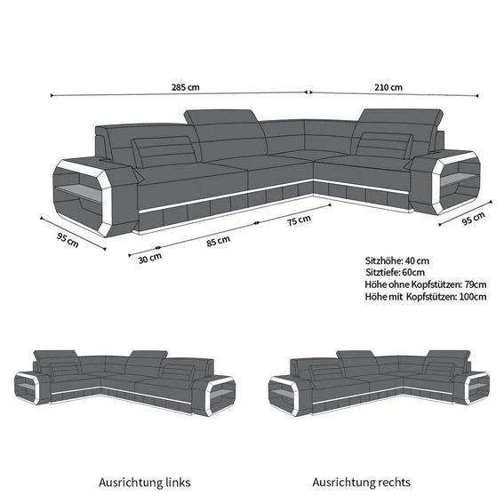 The designer sofa Genesis combines fabric and leather covers and can also be equipped with a practical It can be equipped with a sleeping function. You have the option of choosing not only the color of the fabric cover, but also the color of the leather accents. With its Elegancen material mix and modern design, the sofa will become a stylish eye-catcher in your living room. Particularly noteworthy is the atmospheric LED lighting, which creates an excellent atmosphere and can be conveniently controlled via the touch wheel remote control. The flexible backrests offer additional comfort. In our online shop, you can design the sofa according to your wishes. When selecting the cover fabric, you can choose from one of three high-quality materials. Our Hugo fabric is characterized by its Elegancen appearance, is comfortable, easy to care for, and very robust with an abrasion resistance of over 30,000 cycles. The Mineva woven fabric has a special structure and is very easy to clean. Despite being abrasion-resistant for over 75,000 cycles, it remains soft and comfortable. Our Sun Velvet woven fabric feels velvety and, despite its softness, is abrasion-resistant for over 50,000 cycles. You can also choose from a wide range of cover colors. You also have the option of deciding whether the sleeping area should be on the left or right.