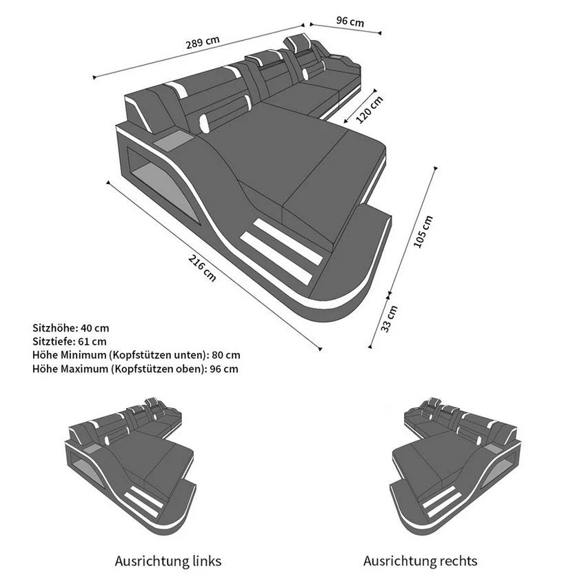 Are you looking for a completely modern corner sofa? The L-shaped Paloma fabric sofa impresses with its particularly elegant design. The wave-shaped armrests harmonize perfectly with the decorative stripes and the shiny storage surfaces. The result is a successful combination of elegance and verve – a real eye-catcher for any living room. You don't have to worry about space problems with this designer sofa. The generous reclining surface provides enough room for two people to stretch out comfortably next to each other. Adjustable headrests guarantee maximum seating comfort, individually adaptable to your needs.