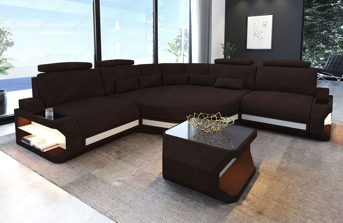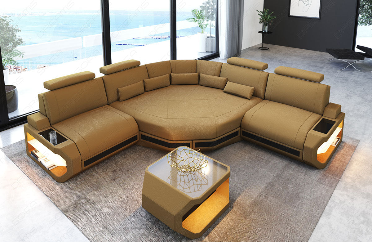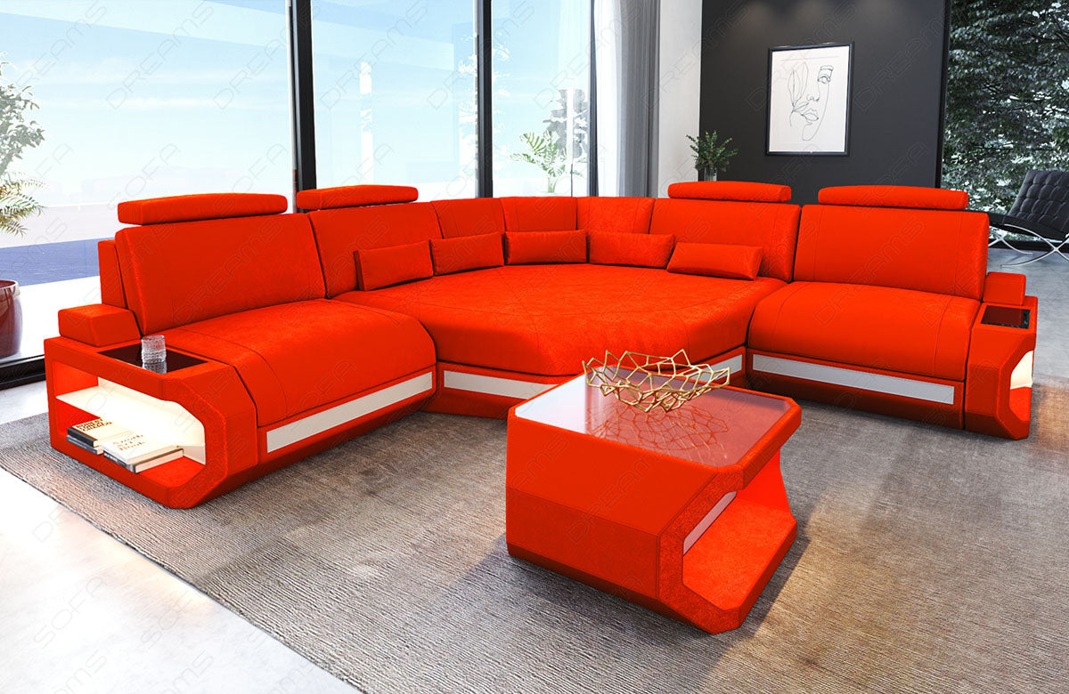 The Rayy L Mini upholstered corner sofa offers a spacious relaxation corner and two seats. The simple and stylish design reflects the modern lifestyle. The sturdy frame is made of high-quality beechwood. The multi-layered polyether cold foam filling ensures comfortable seating. The XL corner features a special high-elastic foam for additional comfort. By choosing the main and accent colors, you can realize your personal style. The armrests offer practical storage space and are equipped with LED lighting. A touch-wheel remote control allows you to adjust the colors and brightness of the lighting. The accent color is faux leather and is used to design the decorative panels on the front. The standard version of the sofa is upholstered in the durable Hugo textured fabric. This fabric is made of a durable flat weave. The Mineva fabric with Easy Clean technology is particularly durable and easy to care for. The Sun Velvet fabric offers a velvety soft feel and vibrant colors. The Altara fabric shines in matte tones and is water-repellent, comparable to the well-known Alcantara fabric. USB ports and a matching coffee table are optionally available.