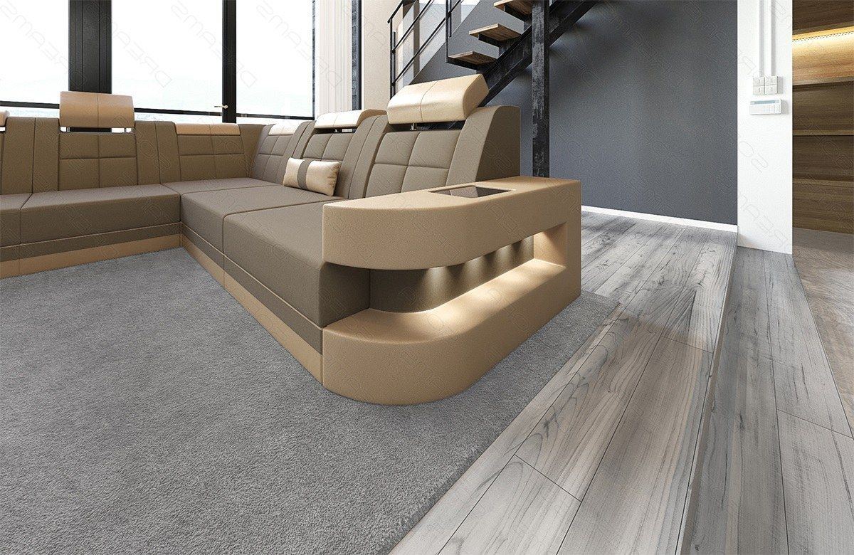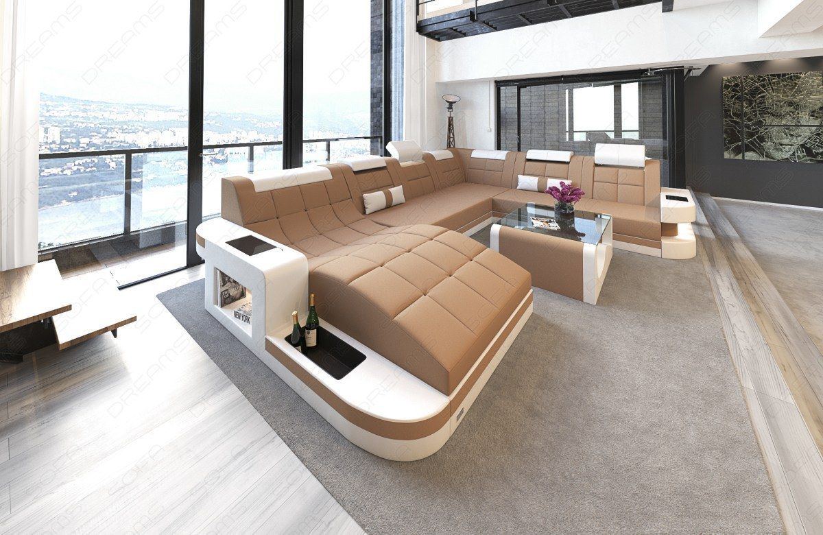 Are you looking for a fabric sofa that will be a real highlight in your home? The XXL Konstantin living area combines all the qualities of an eye-catcher, a relaxation oasis, and a sociable meeting place. Its impressive size and unique design make it a visual centerpiece in your living room. The gentle curves and the wave-shaped reclining surface convey harmony and well-being. Extras such as the integrated LED lighting in the sofa frame and the color-contrasting headrests underscore the modern style of this designer sofa.