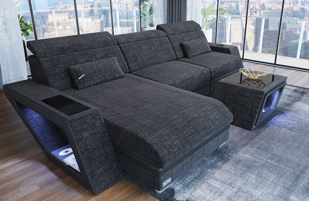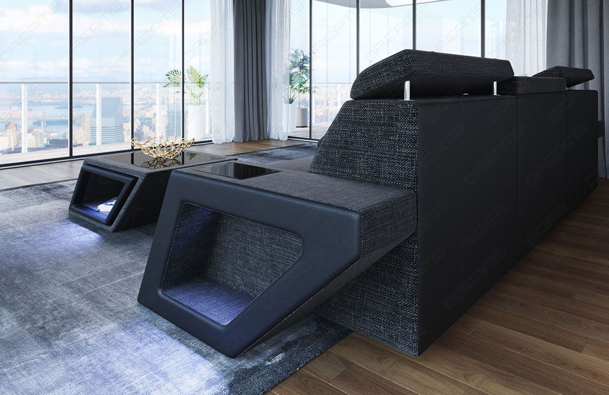 This dark grey Naomi sofa with vibrant blue lit storage combines utility with ultra modern aesthetics. Perfect for those who love a bold and practical home setup.