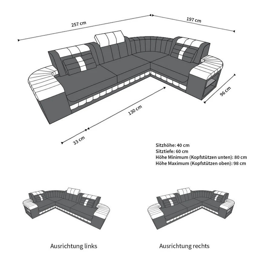 The couch not only impresses with its stylish shape and modern design, but also with the RGB LED lighting in the armrests. This creates an impressive ambience in any living room and can be conveniently controlled via the touch wheel remote control. This is complemented by practical glass storage areas in the armrests. Adjustable headrests also offer optimal comfort when sitting or relaxing.
