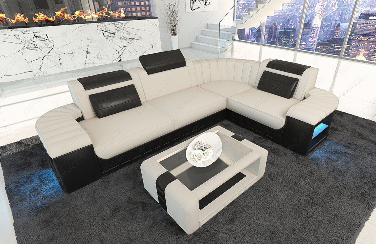 The modern Bigato corner sofa combines high-quality fabric and leather covers. It is partially elegantly quilted and can be optionally supplemented with a stool and USB port. Additionally, you can choose between black or white leather accents, which harmonize perfectly with the color of the fabric cover.