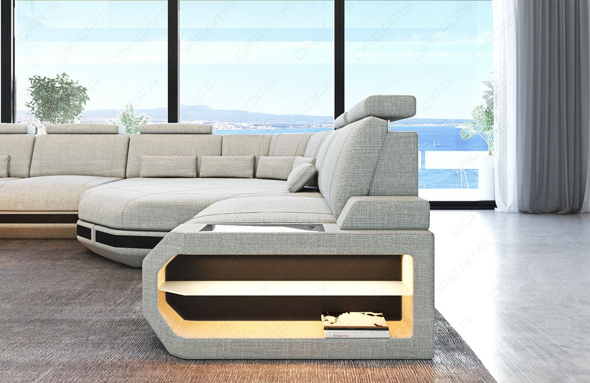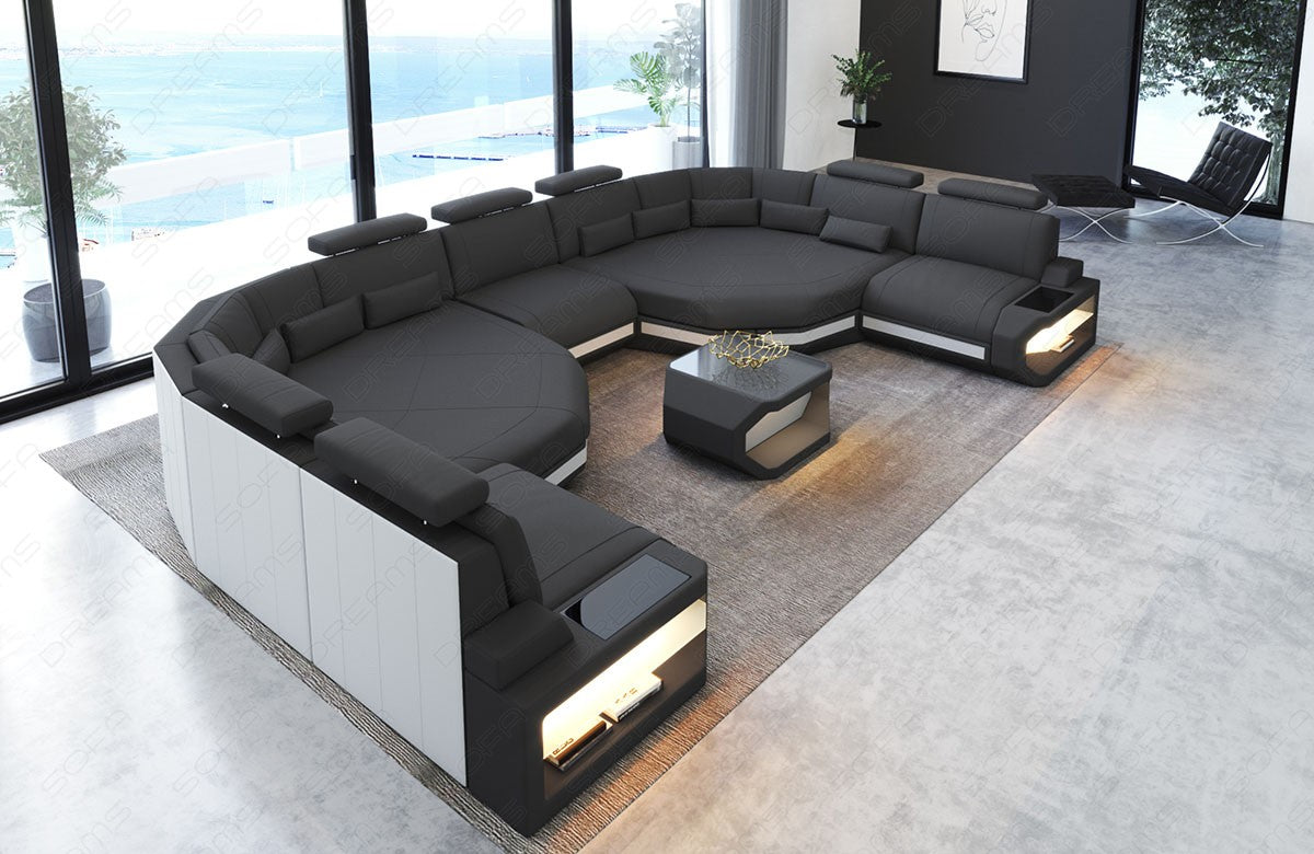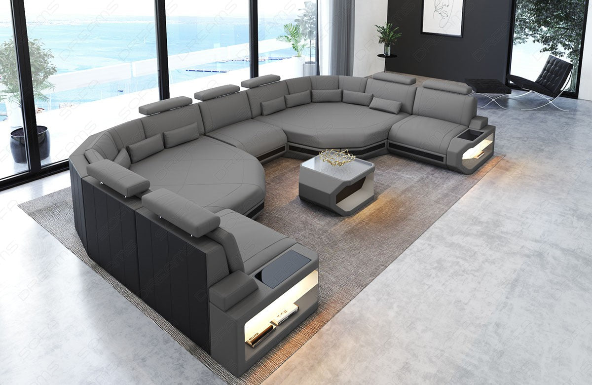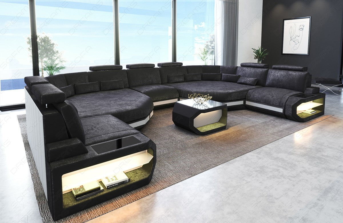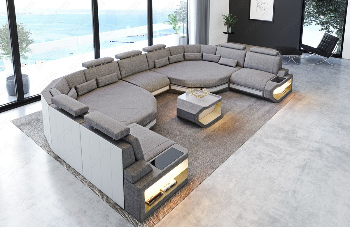 The Rayy XXL fabric living area in U-shape impresses with Generous space and a modern design. Two XL corners with wide reclining surfaces offer plenty of room to relax and make this living area a popular focal point in the living room. The sturdy frame is made of high-quality beechwood. A multi-layered polyether cold foam filling ensures excellent seating comfort, while the Bonnell springs prevent deformation of the seat surfaces. The XL corner features a special high-elastic foam for additional comfort. The armrests feature storage areas equipped with LED lighting, controlled by a touch-wheel remote control. The decorative panels on the front are finished in an accent color made of synthetic leather. The standard version of the living area is upholstered in the robust Hugo textured fabric, which is particularly durable. The Mineva microfiber fabric with Easy Clean technology allows for easy cleaning. The soft Sun Velvet velvet fabric offers a particularly pleasant feel. The Altara fabric, with its matte sheen, is easy to care for and is particularly suitable for households with pets. The sofa can be flexibly expanded. USB ports and a matching coffee table are available upon request.