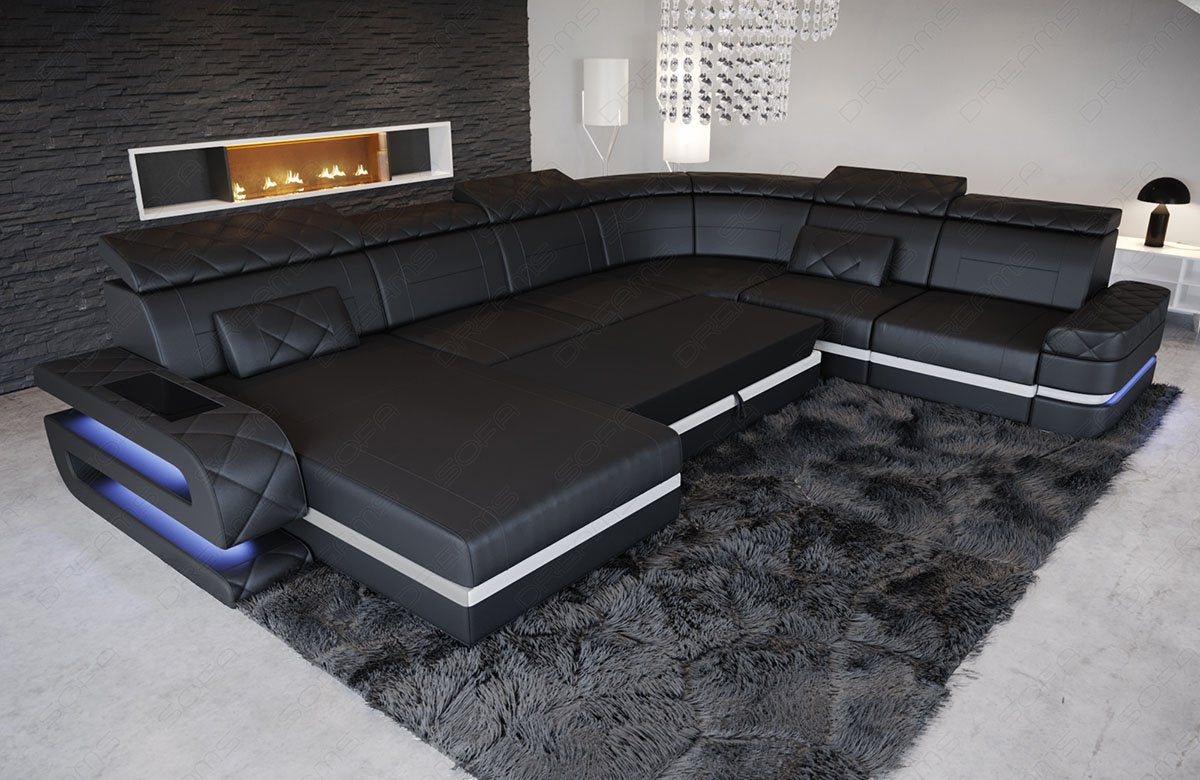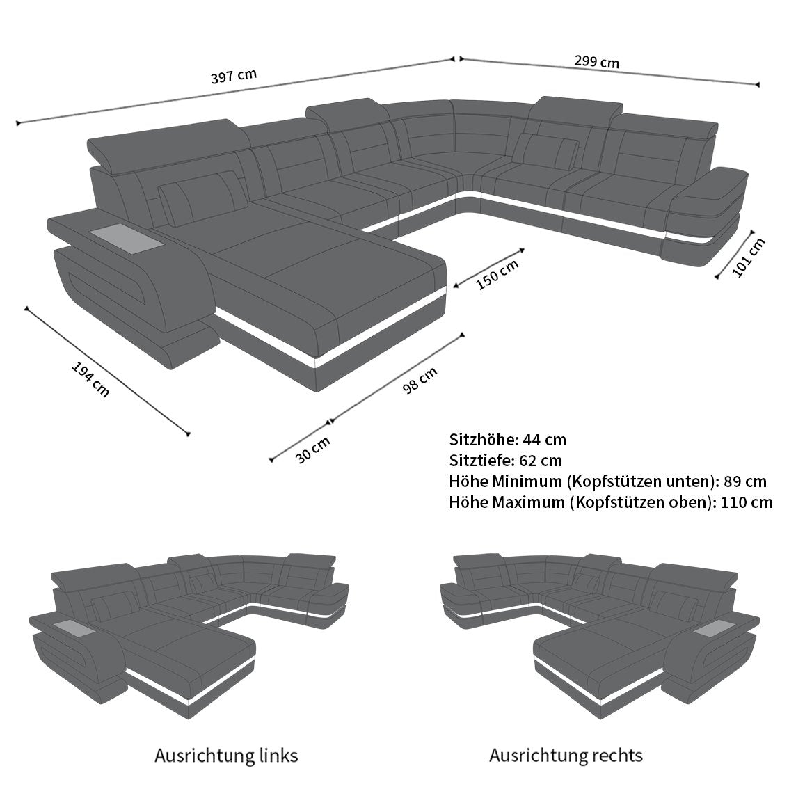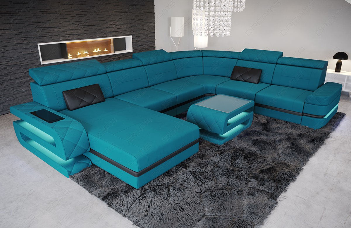 The XXL The Bologna upholstered living area offers you both plenty of space and maximum comfort. With the customizable LED lighting, you can illuminate the upholstered furniture in a variety of colors as desired. The XL sofa is available in three different fabrics and various colors, allowing you to create your dream sofa exactly as you imagine it. The elegant quilting on the armrests, cushions, and headrests is particularly striking. A folding armrest with additional storage space is also included. Upon request, you can upgrade the sofa with various features such as a USB port or a sleeping option. Additional optional features such as a relaxation function or a drinks cooler are also available.