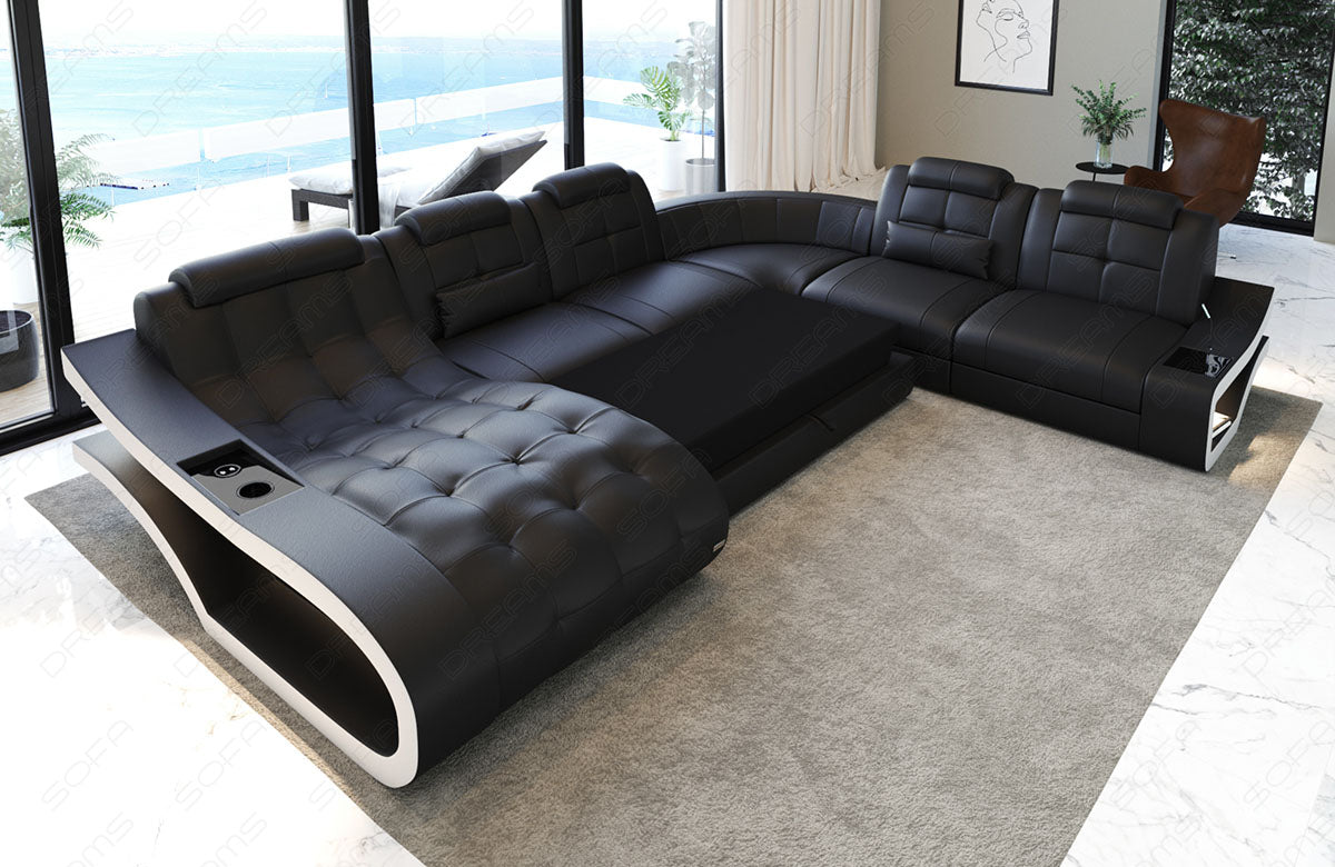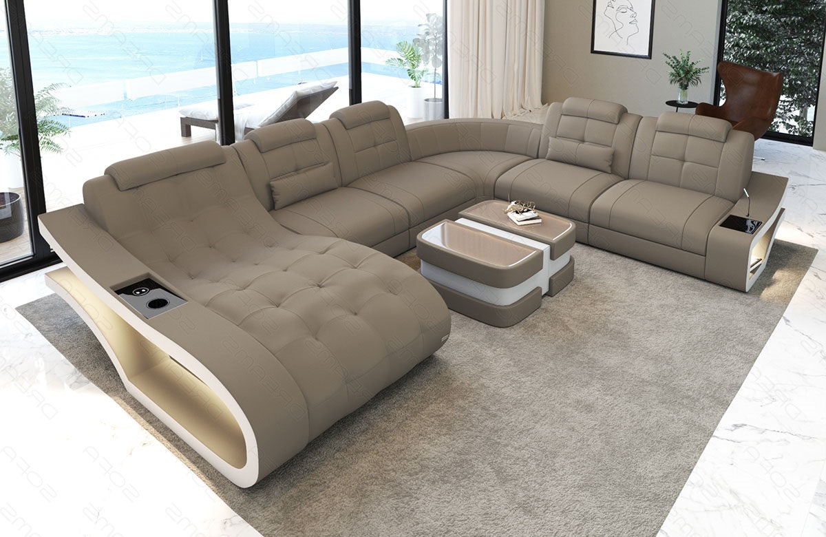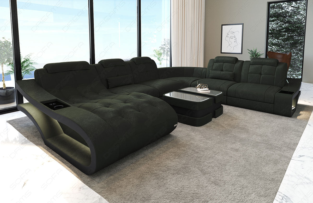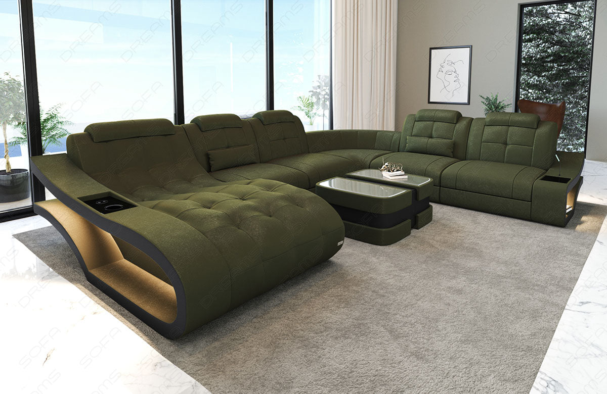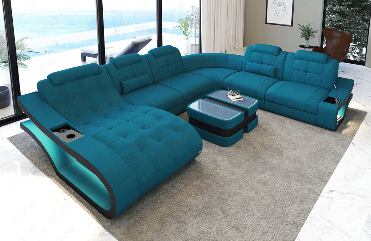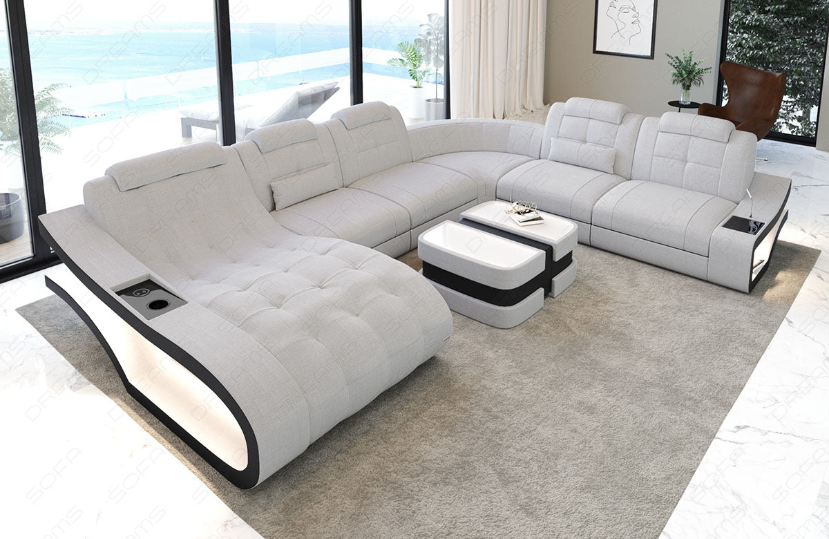 The Elegance XXL fabric living area brings luxurious elegance to your home. The U-shape with ottoman, which, together with four additional seats and a seating area, provides ample space, creating a spacious area for relaxing and enjoying. The headrests are comfortably padded but not adjustable. The ottoman is quilted and can be positioned left or right as desired. LED lighting is integrated into the side panels, allowing color changes using a remote control. The stable frame of this living area is made of durable, crack-resistant beechwood. A multi-layered polyether cold foam filling and Bonell springs ensure a high level of comfort and prevent unwanted seat deformation. The upholstery of the living area is available in various fabrics. In addition to the standard version with durable textured fabric, microfiber fabrics, elegantly shimmering velvet fabrics, and a suede look are also available. The faux leather accent color adds elegance to the edges of the LED lighting. This living area can be expanded with a sleep function, USB ports in the armrests, and a matching coffee table.