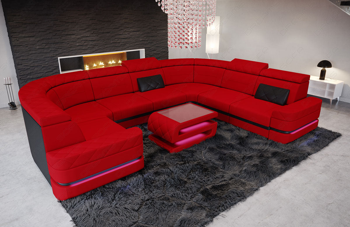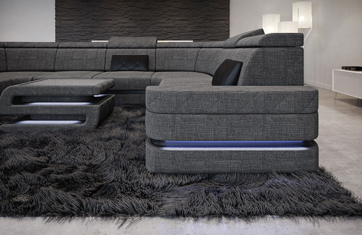 After you've chosen one of the outstanding upholstery fabrics, the next step is choosing the color. The Privilego living area can be upholstered in classic colors such as black, gray, brown, or ivory for the main color. For accent colors, we offer a wide selection of classic and striking colors such as red, orange, pink, or blue in our premium synthetic leather. Once you've chosen both the fabric and the color, the foundation for your dream sofa is laid. But the details are also crucial. You can choose the orientation of the long side of the sofa, either left or right. Optionally, you can also add a practical USB port with a reading light. The armrests, which are equipped with storage space, feature atmospheric LED lighting that you can set to your desired color. With the remote control, you can adjust the color of the LED lighting to your liking. Additional features such as an electric relaxation function and cooling cup holders make your new living area even more comfortable. Imagine yourself relaxing with the adjustable headrests and the relaxation function, while setting the perfect lighting mood at the touch of a button, charging your devices, and enjoying a cool drink from the practical beverage coolers right next to the sofa. The Privilego fabric living area offers all this and much more!