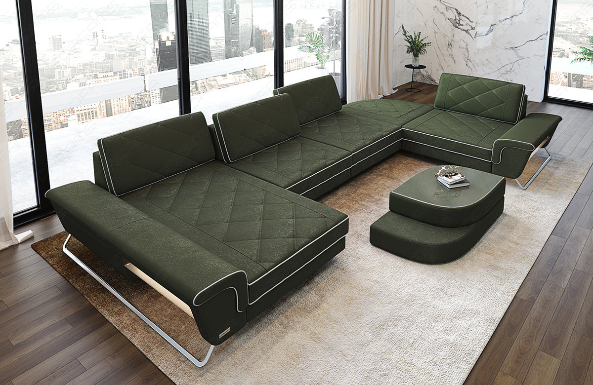 The Lari U-shaped upholstered living area impresses with elegant chrome feet and a combination of fabric and leather covers. The modern design and material mix make this sofa a stylish highlight in any living room. Particularly noteworthy is the RGB LED lighting, which creates a pleasant atmosphere and is conveniently controlled via a touch wheel remote control. You can customize the sofa entirely according to your wishes. We offer three different fabric types: The textured Hugo fabric impresses with its elegant appearance and is both comfortable and easy to care for. With a wear resistance of over 30,000 cycles, it is also particularly robust. The microfiber Mineva fabric is characterized by its special structure and easy stain removal, which is easily achieved with a damp cloth. Despite its high durability of over 75,000 cycles, the fabric remains pleasantly soft. The woven Sun Velvet fabric feels like velvet and offers high wear resistance of over 50,000 cycles. The sofa also features a practical center console (optional), which includes an electrically extendable power strip, two USB ports, and a chrome-plated drawer with a movable panel in high-gloss black.