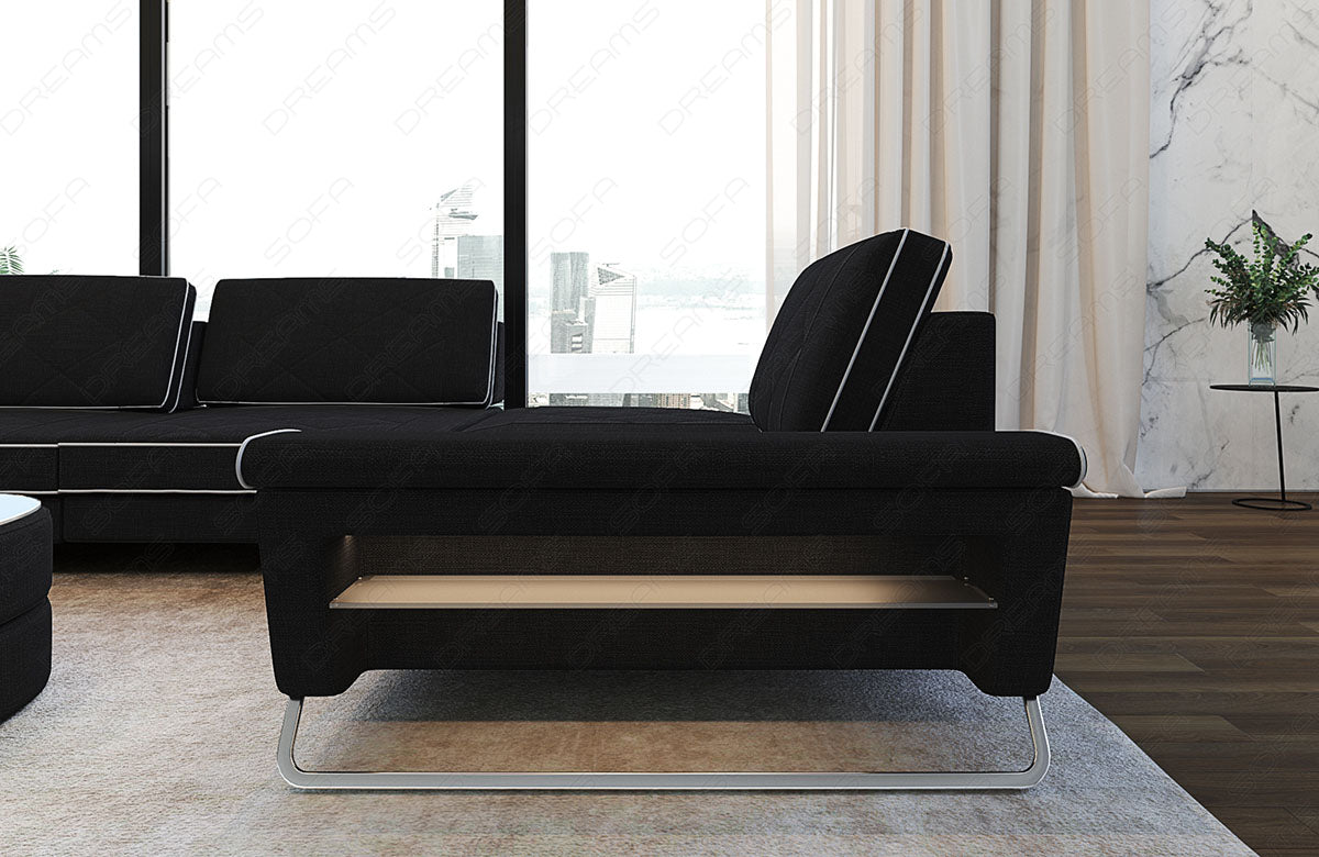 When selecting the upholstery fabric, you can choose not only from classic colors like black, gray, or white, but also from a wide range of colors that leaves almost nothing to be desired. The decorative stripes are also available in many colors. You can also decide whether the ottoman of your desired sofa should be positioned on the left or right.