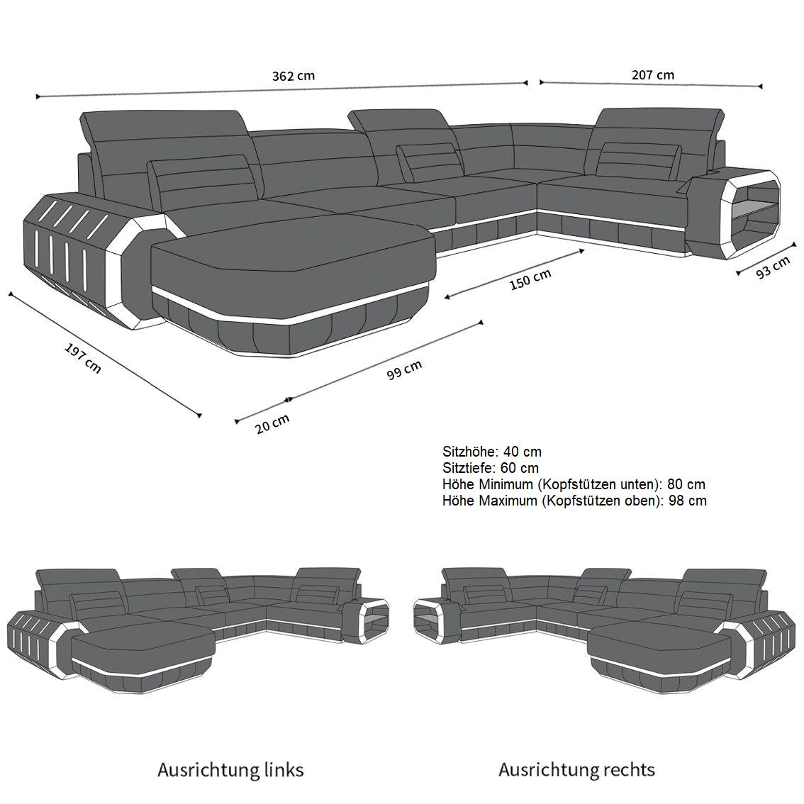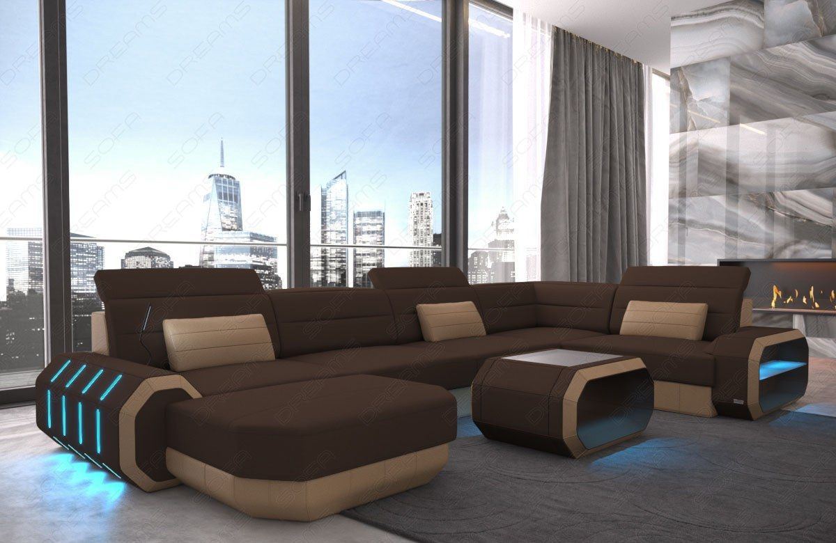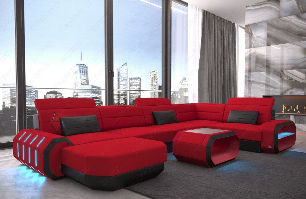 Our stylish Rome living area is not only Available not only as a compact corner sofa, but also in a spacious U-shape—ideal for convivial evenings with friends or family. Here, modern design meets generous space and excellent comfort. The larger version particularly showcases the artistic details: the octagonal armrest with integrated LED lighting and the gently curved backrests not only offer a beautiful appearance but also the utmost comfort. Those who like comfort will feel particularly at home on the spacious reclining surface. It's the perfect new favorite spot in your living room. Choose from various fabric covers and a wide range of colors to customize the sofa to your taste.