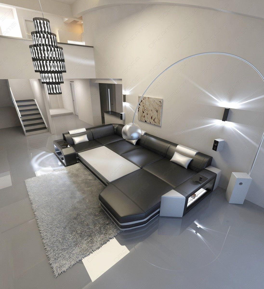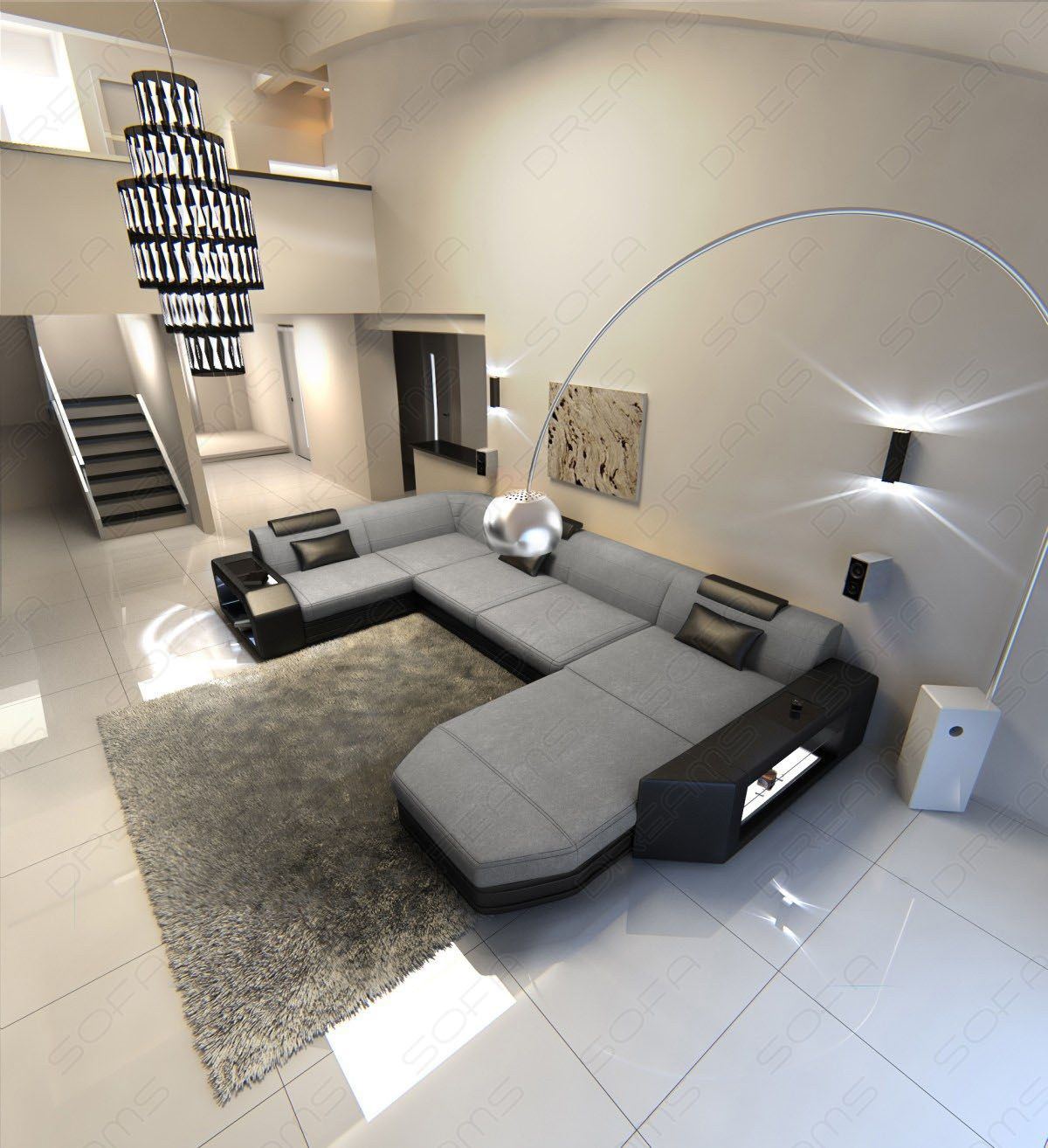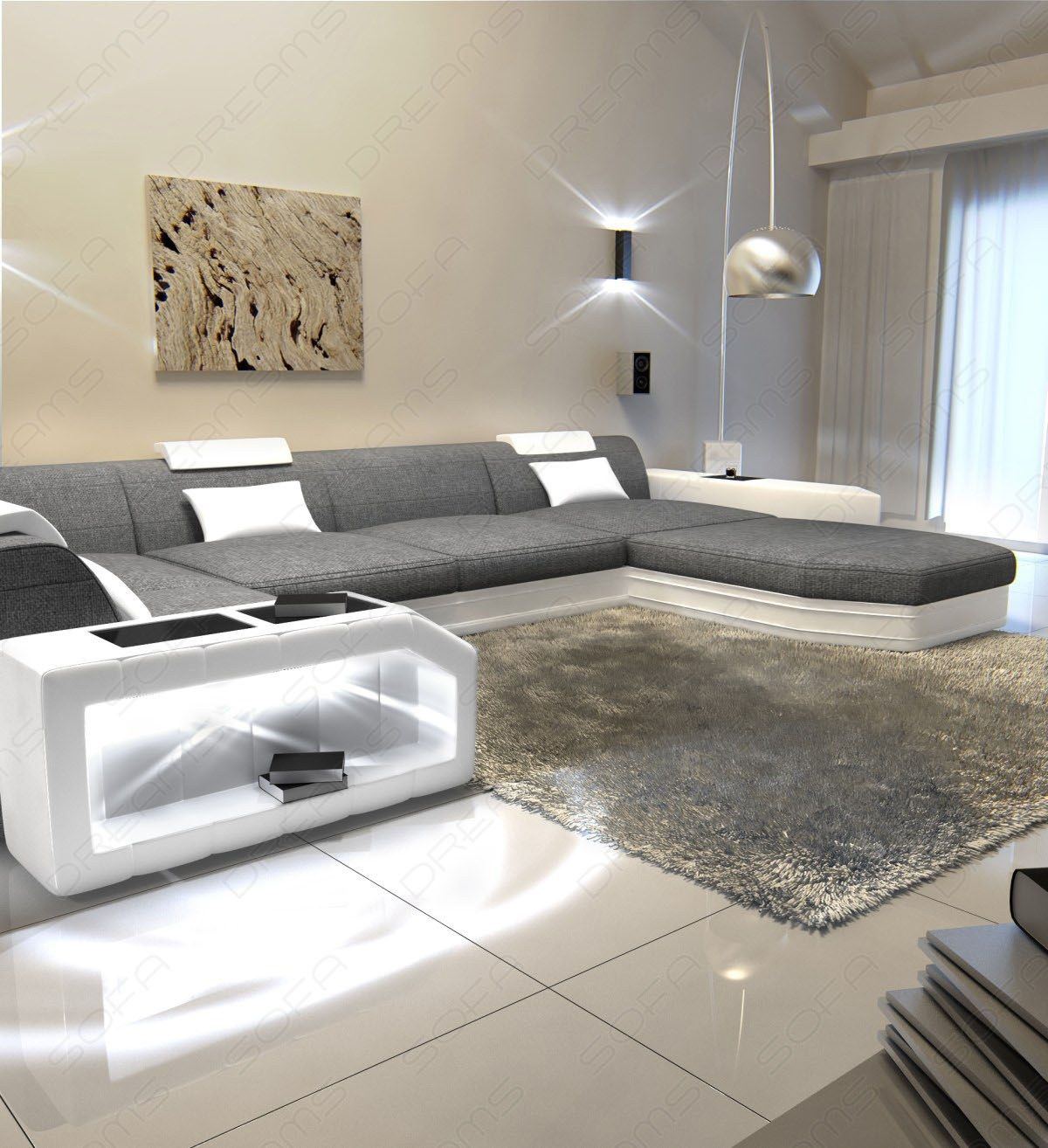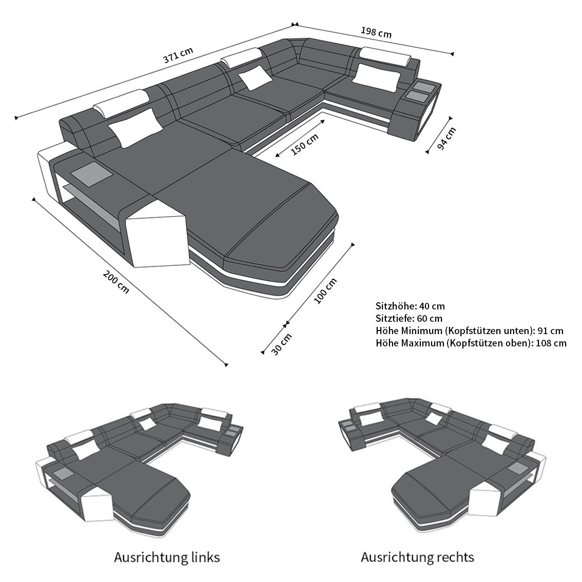 Enough of the marveling – now it's time to relax and enjoy the many benefits of this living area. Adjust the headrests to your liking, enjoy the excellent suspension during a short break, or create colored lighting effects on the sides of the sofa with the remote control. The practical storage space in the frame ensures that your favorite drink is always within easy reach. Convinced? Then order the Presto designer sofa today in the version of your choice – also available in L-shape or XXL!