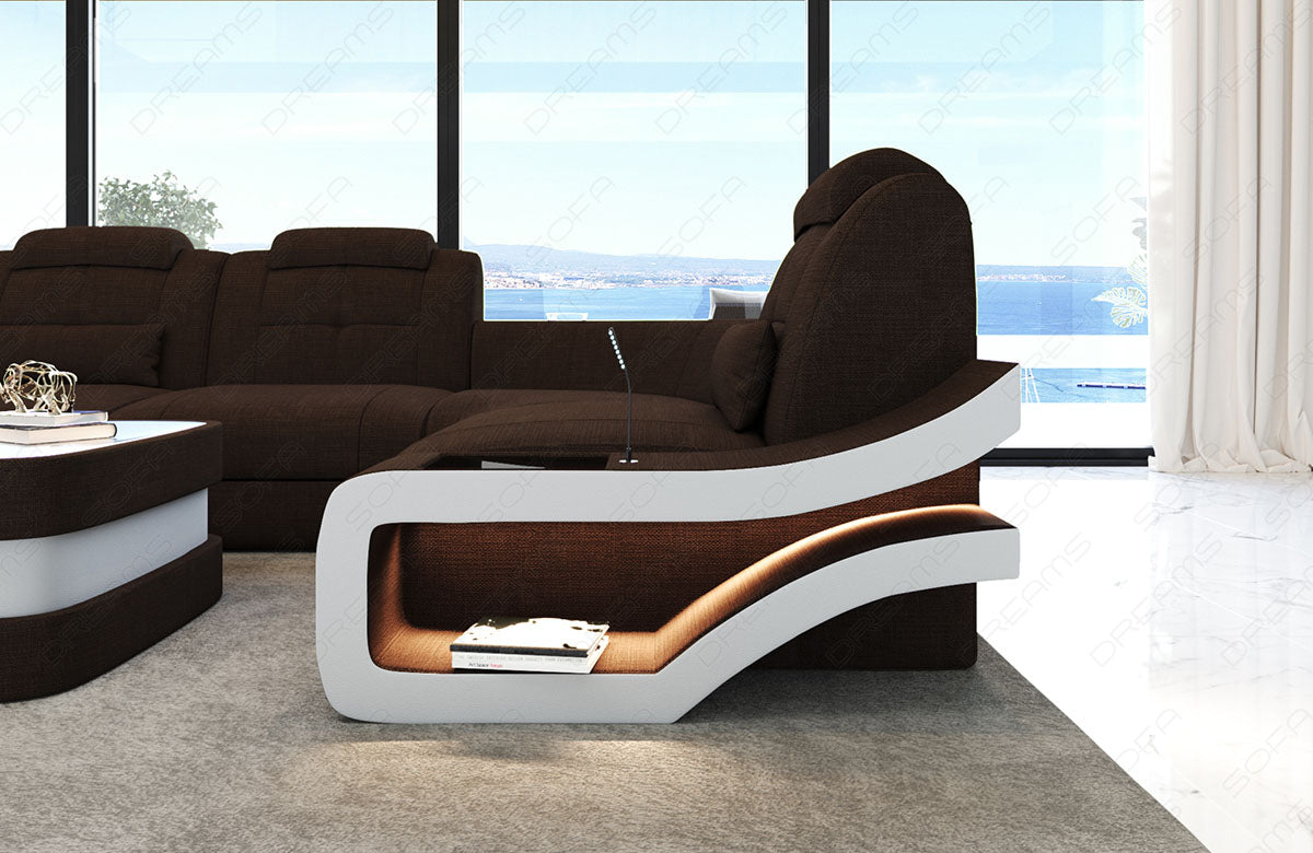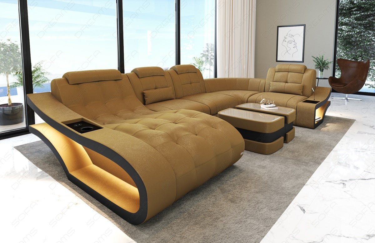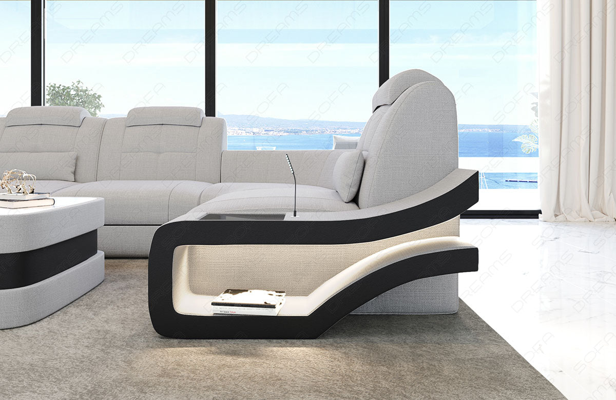 The Elegancer U-shaped upholstered living area, with its modern design, presents itself as the stylish centerpiece of the living area. Three separate seating elements and a cozy seating area, together with the ottoman, offer ample space for family and guests. The ottoman, with its comfortable reclining surface and fine quilting, can be positioned either to the left or right as desired. The side panels feature a storage area and integrated LED lighting with remote control, which provides atmospheric lighting. The headrests offer a high level of comfort but are not adjustable. The sturdy frame of this living area is made of crack-resistant beechwood. Bonell springs and a polyether cold foam filling guarantee comfortable seating and prevent seat deformation. The model is covered in a durable textured fabric as standard. Velvety fabrics, a microfiber material, and a suede-look cover are also available in various colors. The accent color for the side panels is faux leather. This living area can be equipped with a bed function and USB ports in the armrests. A matching coffee table is also available as an option.
