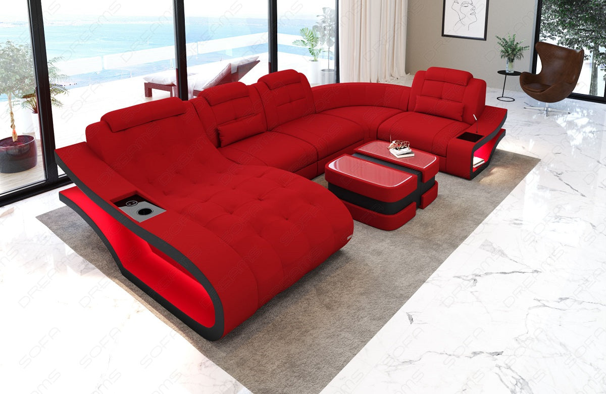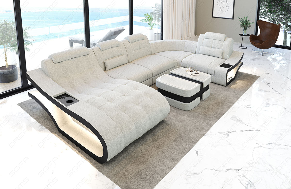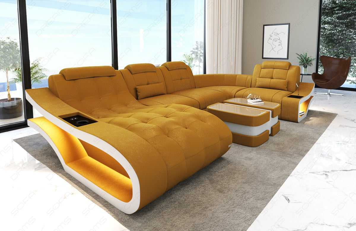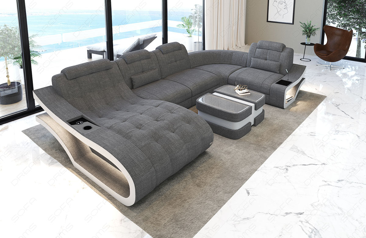 The Elegancer U-shaped upholstered living area, with its modern design, presents itself as the stylish centerpiece of the living area. Three separate seating elements and a cozy seating area, together with the ottoman, offer ample space for family and guests. The ottoman, with its comfortable reclining surface and fine quilting, can be positioned either to the left or right as desired. The side panels feature a storage area and integrated LED lighting with remote control, which provides atmospheric lighting. The headrests offer a high level of comfort but are not adjustable. The sturdy frame of this living area is made of crack-resistant beechwood. Bonell springs and a polyether cold foam filling guarantee comfortable seating and prevent seat deformation. The model is covered in a durable textured fabric as standard. Velvety fabrics, a microfiber material, and a suede-look cover are also available in various colors. The accent color for the side panels is faux leather. This living area can be equipped with a bed function and USB ports in the armrests. A matching coffee table is also available as an option.