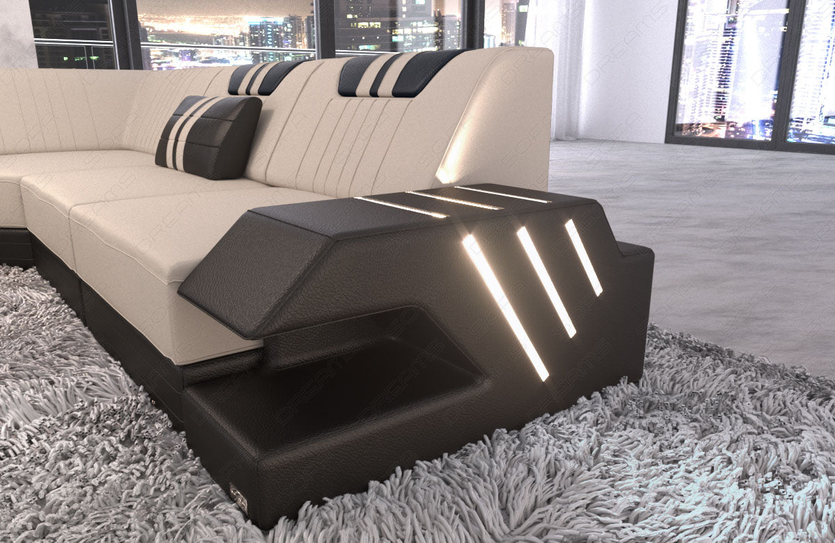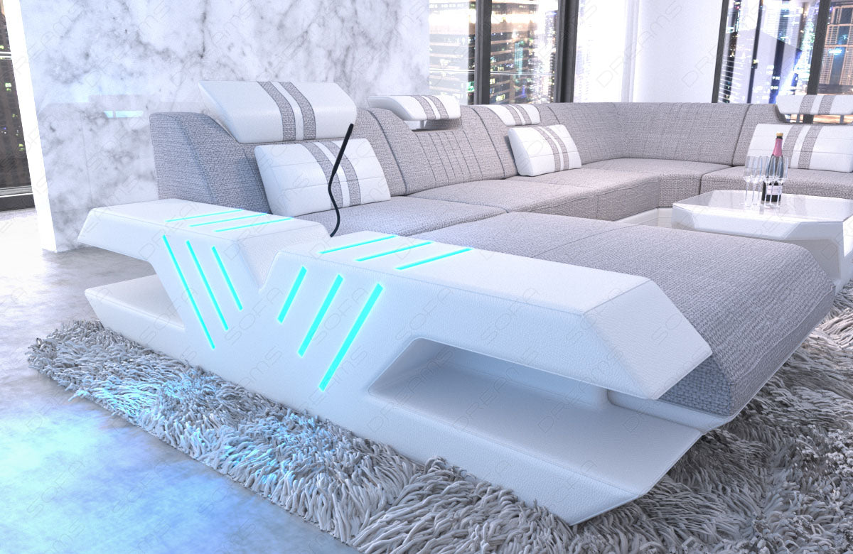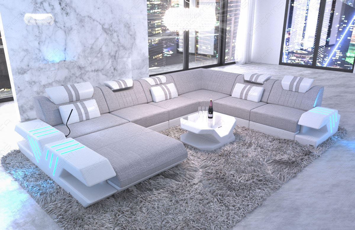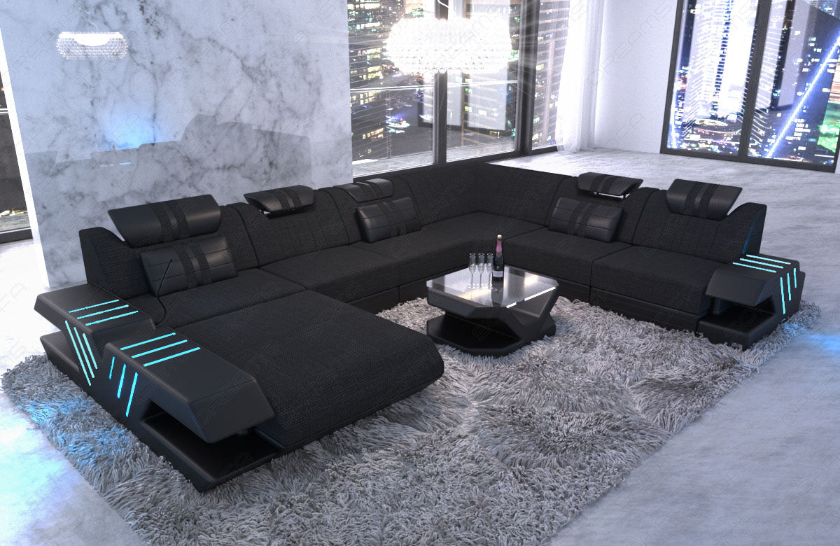 The Venezia XXL upholstered sofa immediately catches the eye with its dynamic curves and elegant fabric covers. The first impression is not misleading, as the sofa perfectly combines design and comfort. Particularly noteworthy is the integrated LED RGB lighting, which can change colors and is conveniently controlled via a remote control and touchscreen. This allows you to always adapt the lighting to your mood. The generous seating areas ensure maximum comfort, offering ample space to relax. This is ensured by the high-quality polyether cold foam filling. The Bonnell springs provide the necessary stability and prevent typical seat deformation. The sturdy beechwood frame forms the backbone of the XXL living area and ensures longevity. The elegant MDF storage surfaces in glossy black complete the elegant appearance of the Venezia XXL upholstered furniture.