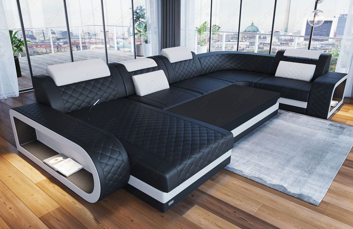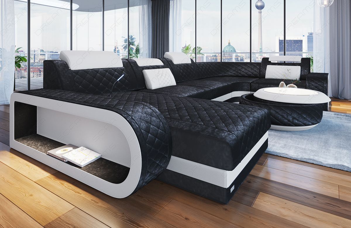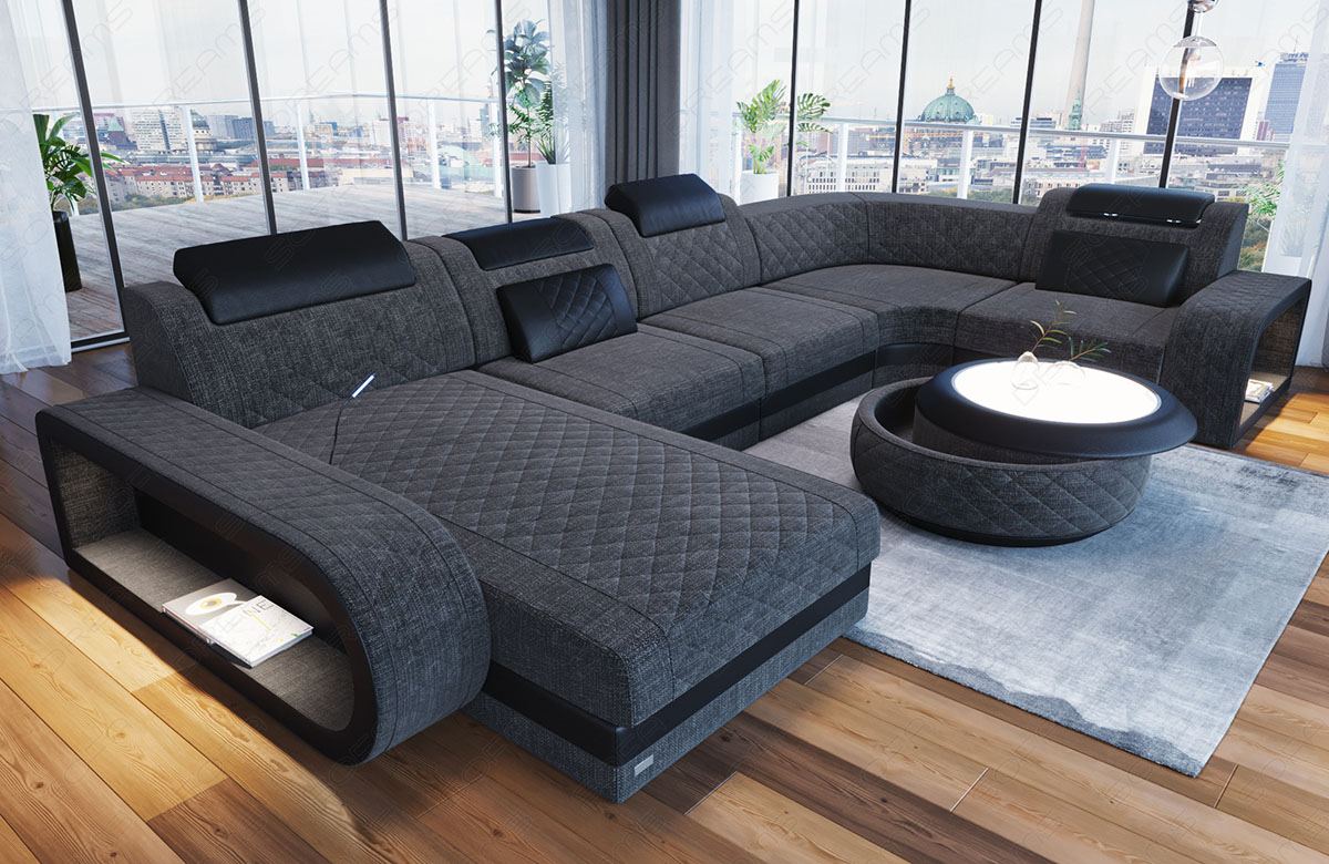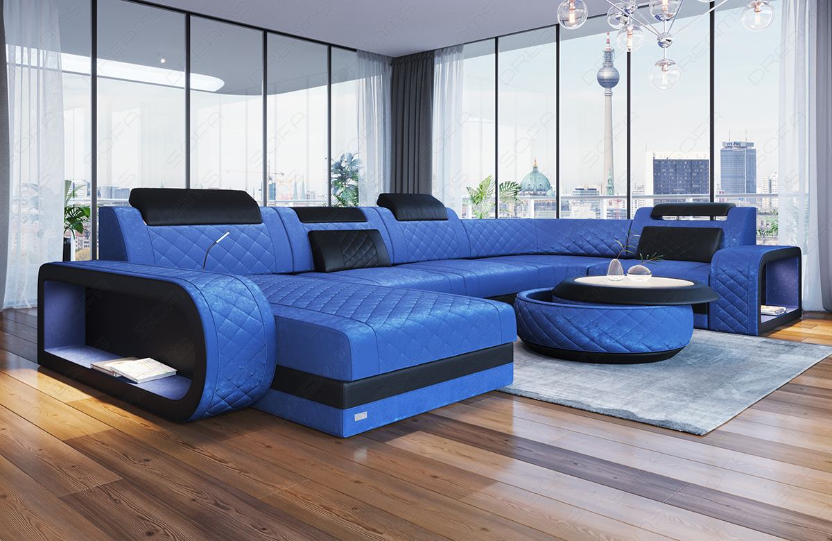 Our modern U-shaped upholstered furniture Berlin is the perfect eye-catcher in every Living room. The corner sofa impresses with its elegant fabric and leather mix and stylish LED lighting on the armrests. The upholstered furniture is equipped with a polyether cold foam filling, which ensures optimal seating comfort. The Bonell spring core supports stability and prevents deformation. The sturdy beechwood frame makes the sofa particularly durable and resilient. Two matching cushions are included. The exact dimensions can be found in the drawing. You can customize the sofa online according to your wishes. You can choose from four high-quality materials. The textured fabric Hugo impresses with its elegant appearance and is particularly easy to care for and durable, with over 30,000 cycles. The Mineva upholstery fabric impresses with its exceptional structure and is easy to clean, despite being very robust, with a durability of over 75,000 cycles. The Sun Velvet fabric feels velvety and, despite its softness, remains durable, with a durability of over 50,000 cycles. Additionally, you can choose from many fabric colors and a leather accent color. You can also decide whether the reclining surface should be on the left or right and whether the corner sofa should be equipped with a sleeping option.
