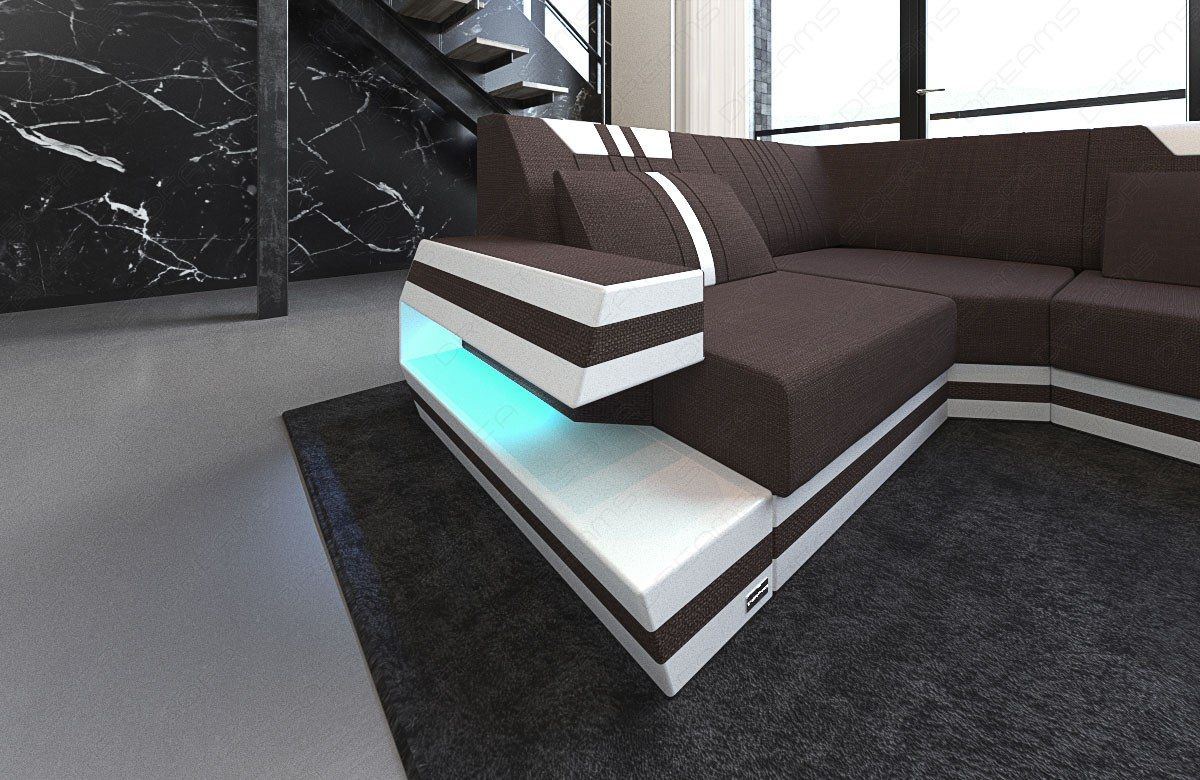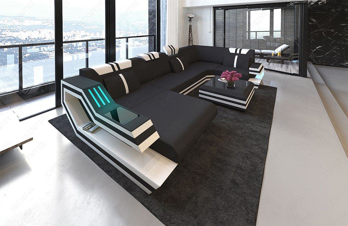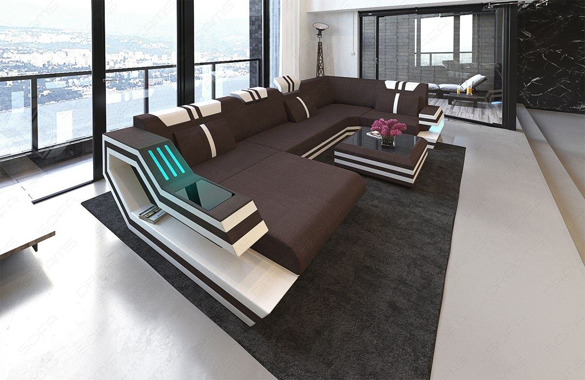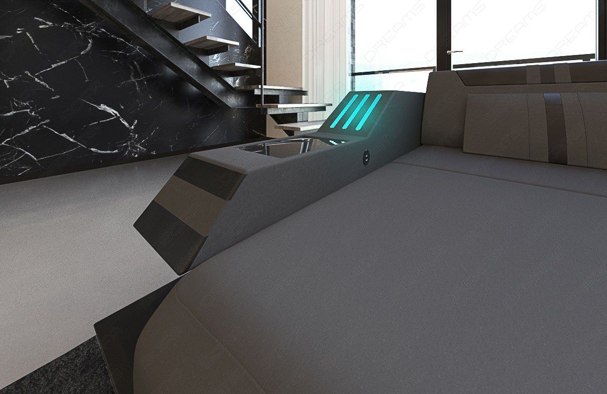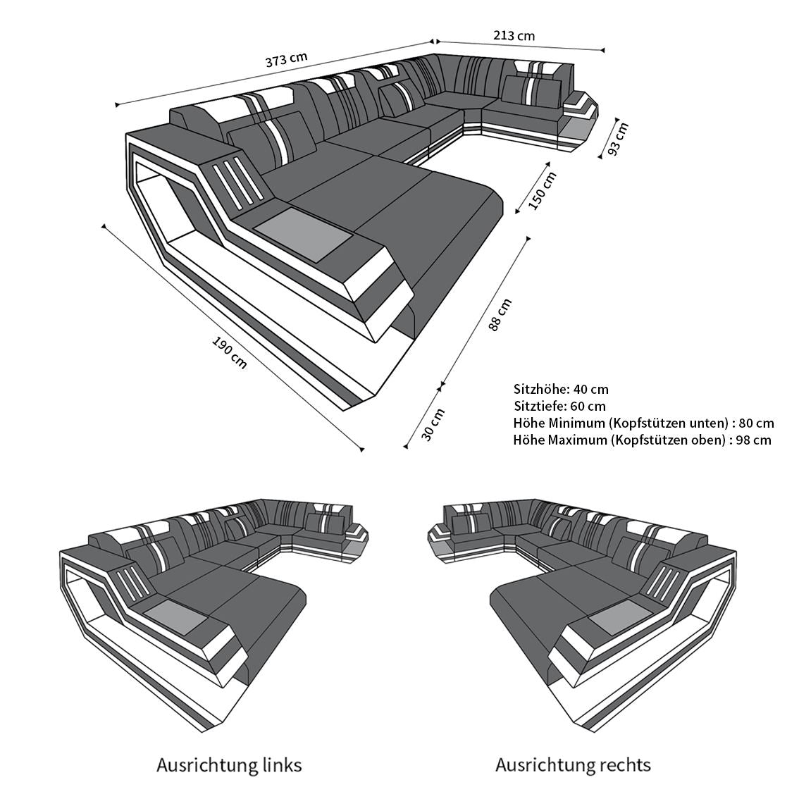 With the Rodeo designer sofa, you don't need additional lamps to illuminate the room. The color-changing LED lighting, integrated into both armrests, provides pleasant light. You can adjust the lighting to your liking using the practical TouchWheel remote control. To ensure comfortable seating while charging electronic devices, a USB port (optionally available) is integrated into the large armrest of the Rodeo living area. You can also choose a matching coffee table and optional sleeping function.