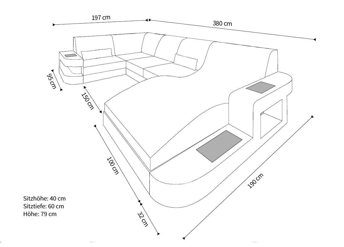 The modern Konstantin U-shaped polyrattan sofa is equipped with LED lighting and features an ergonomic wave ottoman. The LED lighting can be easily controlled with the included touch-wheel remote control. Polyrattan is suitable for both indoor and outdoor use. Unlike natural rattan, this material is resistant to temperature fluctuations and humidity, yet retains its natural appearance. The sofa features cream-colored cushions and comes with the reclining area/ottoman on the right side (as shown in the picture).