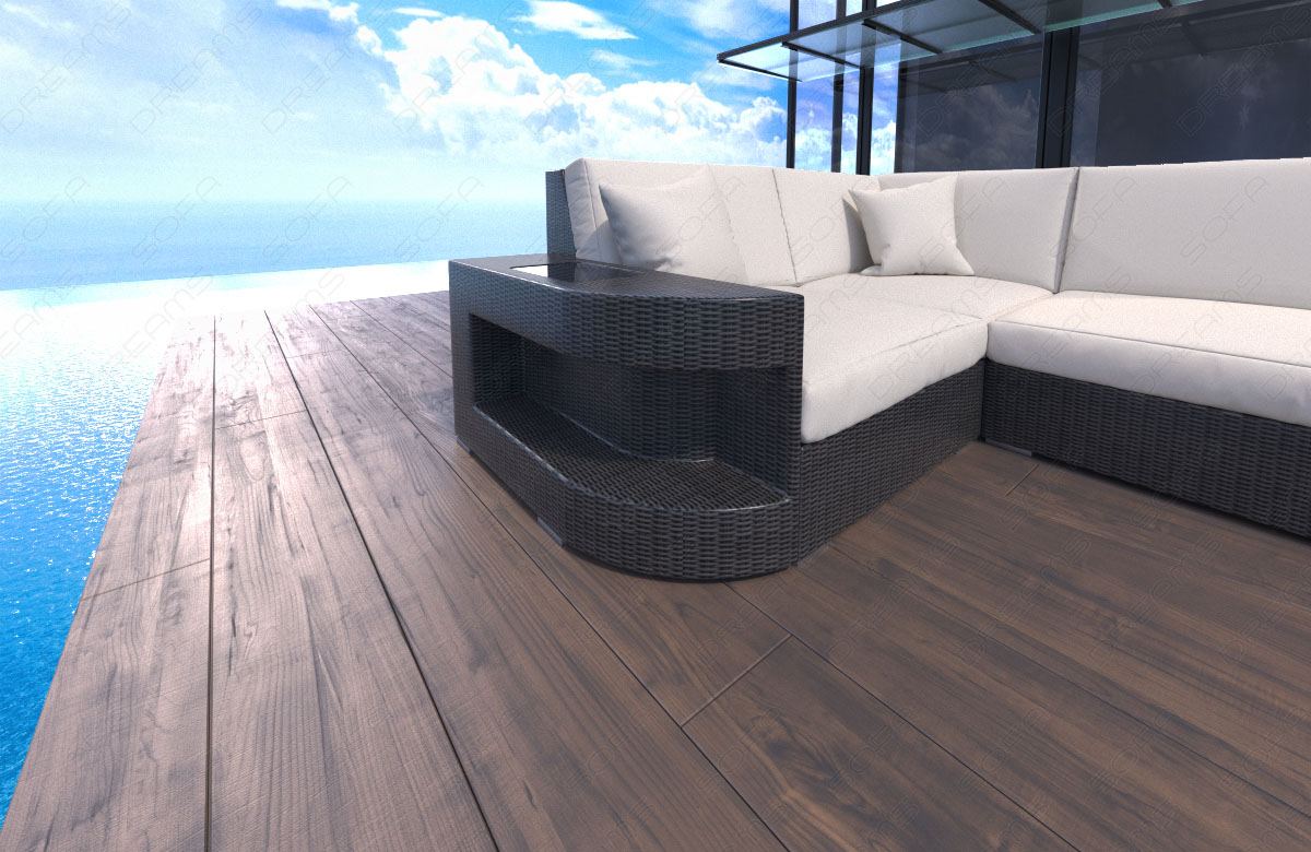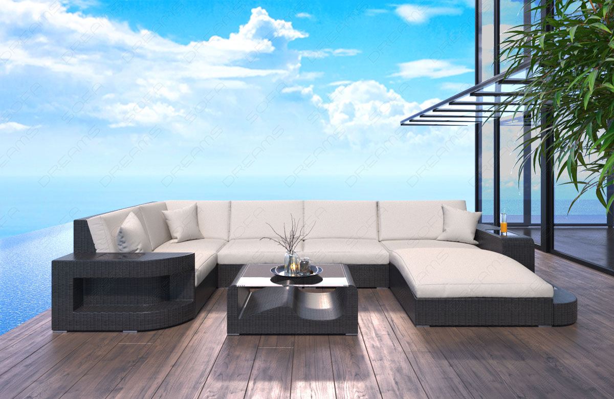 Konstantin U-shaped polyrattan sofa with LED lighting and cream-colored cushions