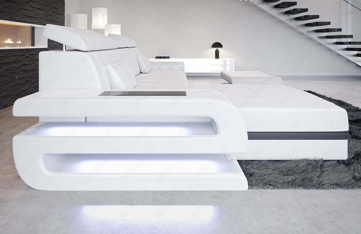 Whether in black, gray, or red, we make no compromises when it comes to comfort. The Bologna corner sofa is equipped with color-changing LED lighting in every version. Upon request, it also features an integrated USB port for charging electronic devices or operating the included reading lamp. The firm Bonell springs and adjustable headrests ensure high seating comfort. Additional storage space is provided in the frame. You can also find the matching coffee table in our shop.