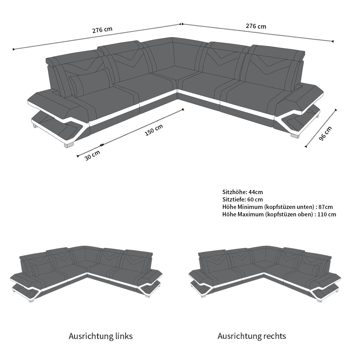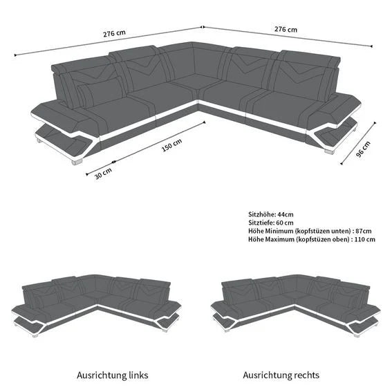 The modern designer L-shaped Serano corner sofa is a real eye-catcher for your living room. Particularly impressive is the RGB LED lighting in the armrests, which, with the practical touch remote control, creates a pleasant atmosphere. Furthermore, the sofa is equipped with adjustable headrests that offer maximum comfort. Thanks to the first-class Bonell suspension, this living area is the ideal retreat for the whole family.